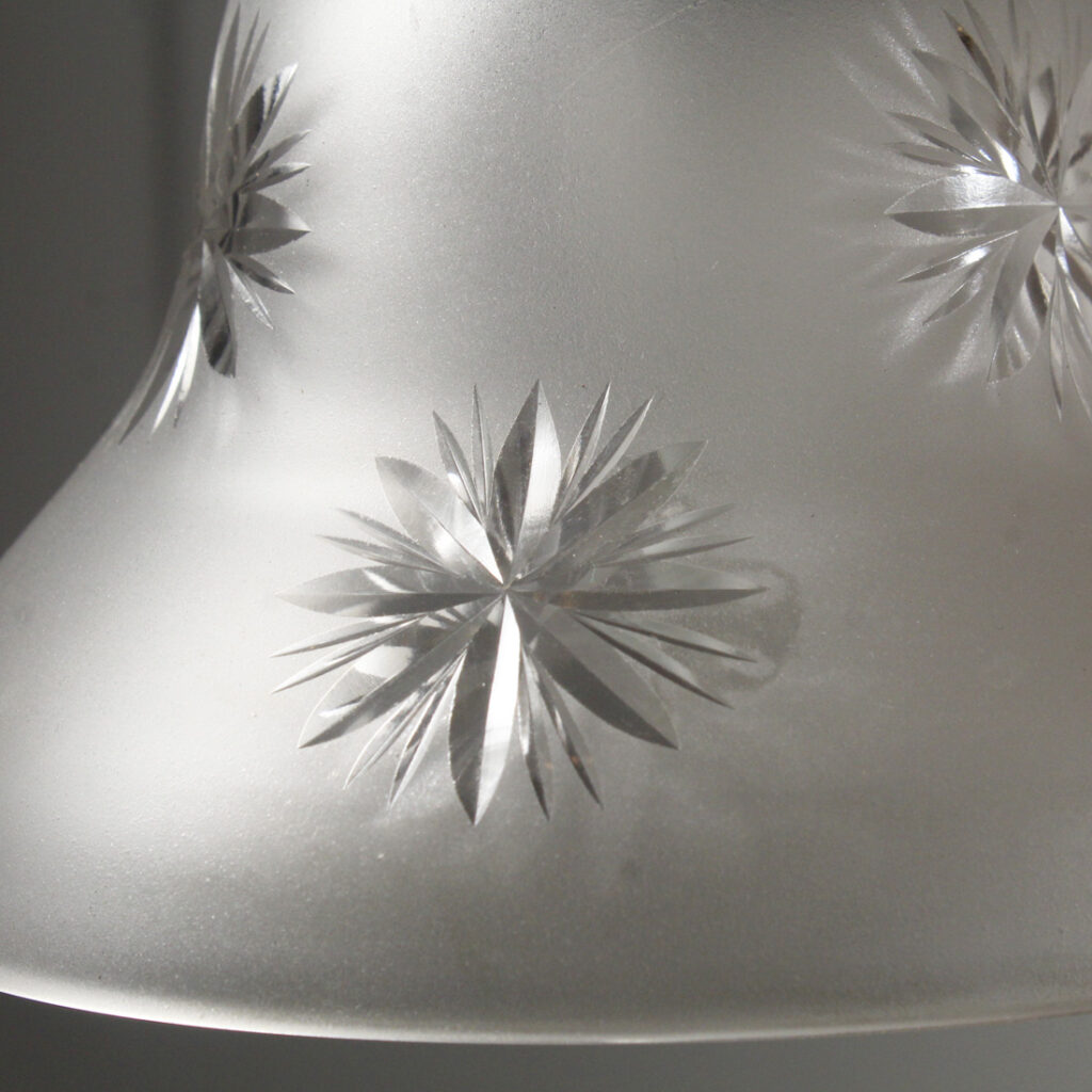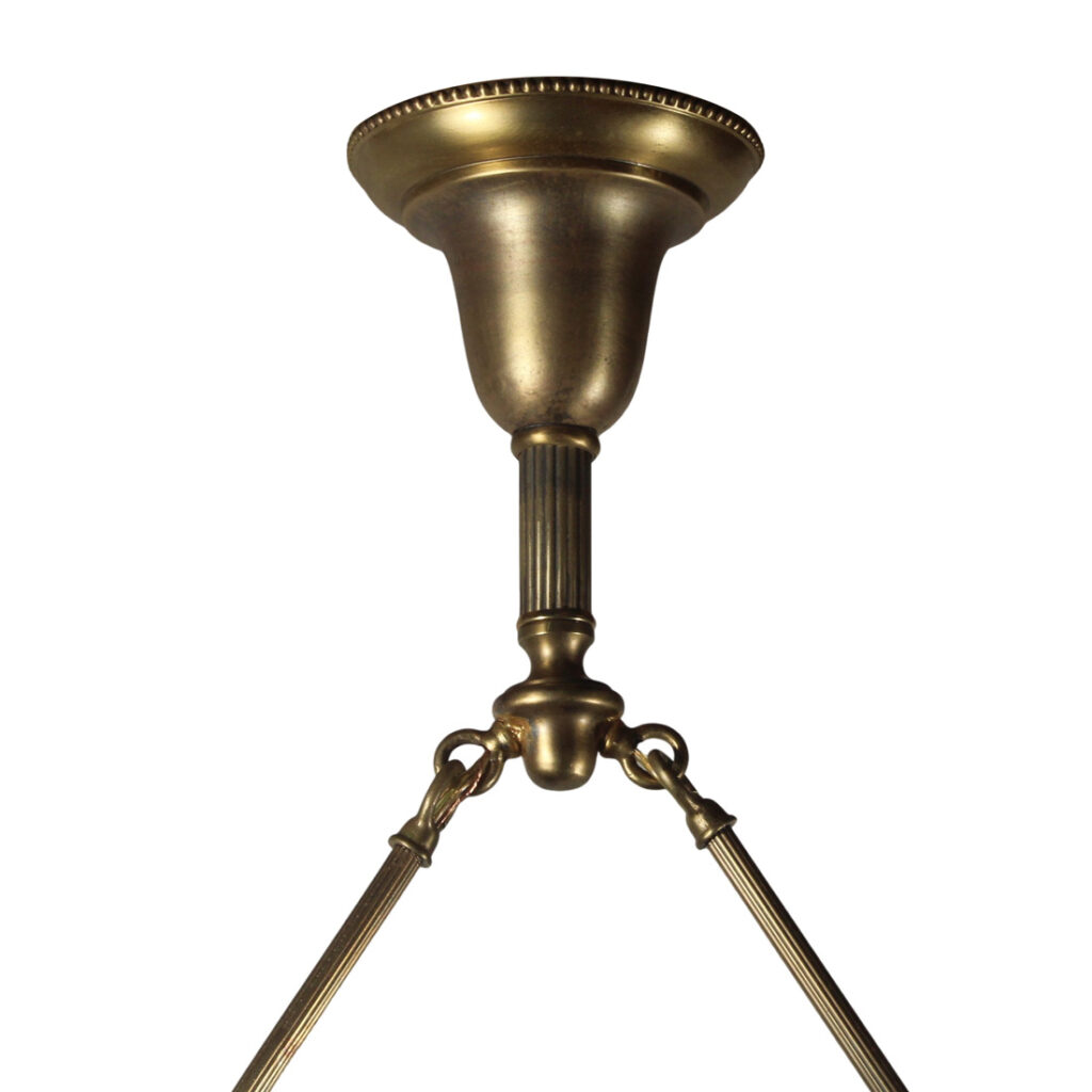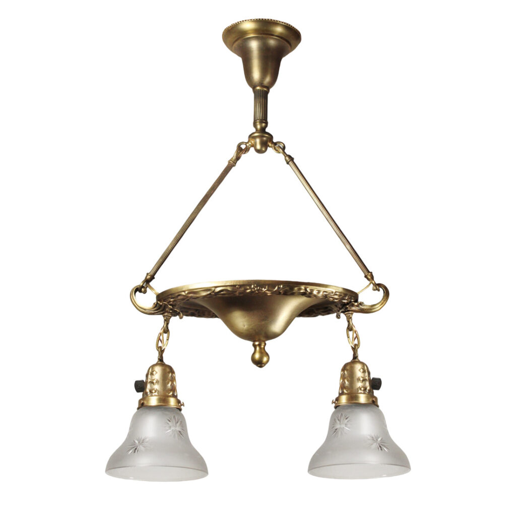 A charming antique two-light chandelier, salvaged out of a home in Cincinnati, OH and dating from the early 1900’s. This brass light fixture begins with an understated brass canopy, from which two rods suspend downward to support a decorative lamp body embellished with foliate details. Two chandelier arms reach out from either side of the body to support a decorative etched glass shades. This light fixture is in excellent condition with no cracks or breaks to the glass, just the expected fleabites around the edges (pictured); it has been professionally rewired and comes with all the necessary attachments for modern installation. The chandelier body measures approximately 15-5/8″ wide, 7-1/4″ deep, and 28-1/2″ long overall.