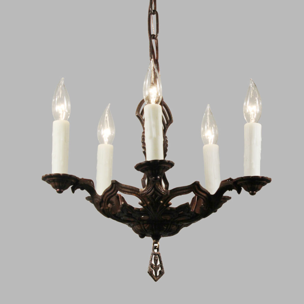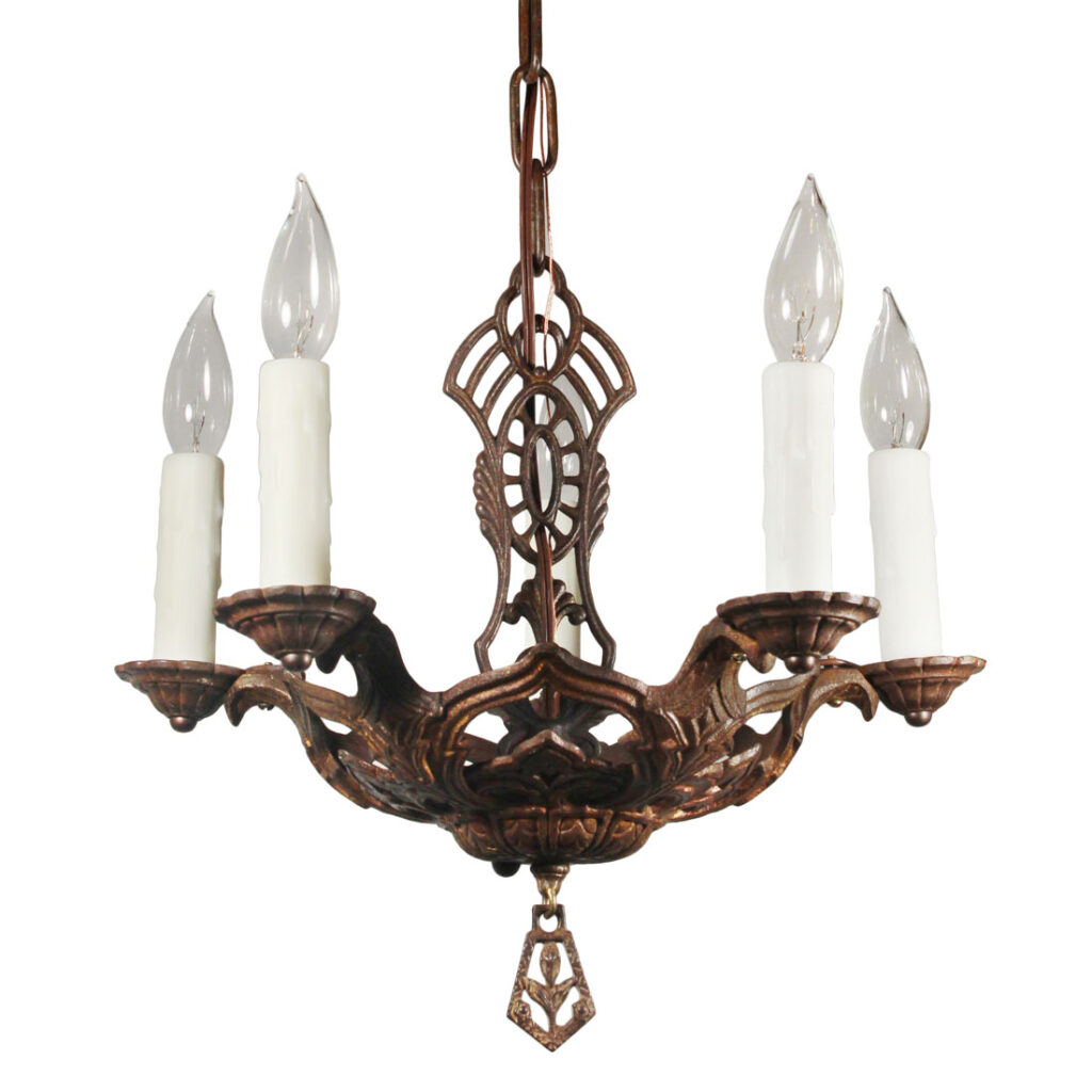 A fabulous chandelier from the early 1900s, salvaged out of a home in Indianapolis, IN. This cast iron chandelier features a fabulous stylized fleur de lis motif, and is in very good antique condition. It has been professionally rewired with all the necessary attachments for modern installation. The chandelier measures 15-1/2″ wide, 14-1/2” tall, and 29-1/2″ overall height.