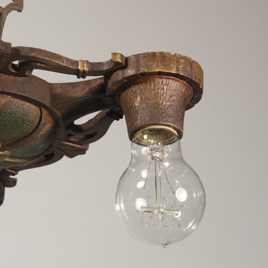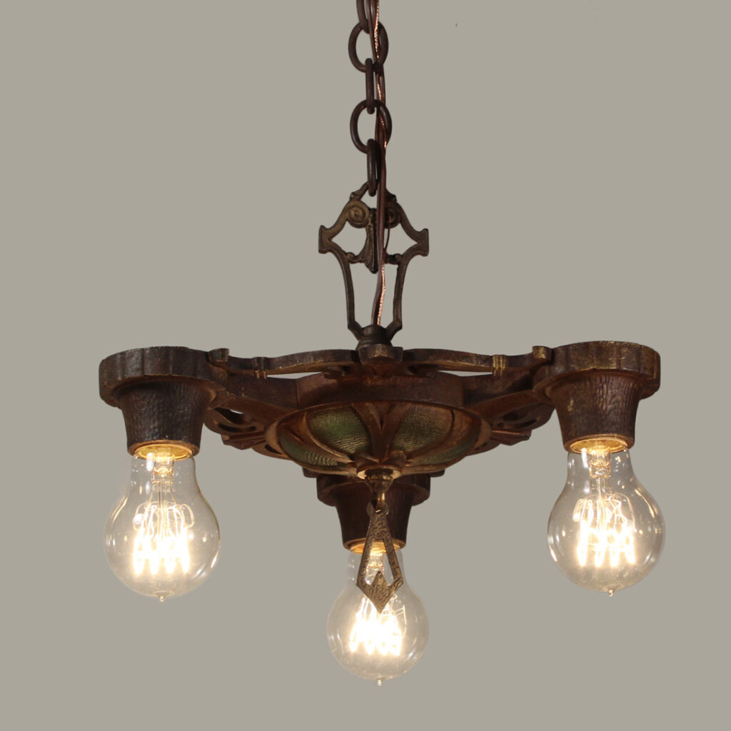 A marvelous antique Art Deco three-light exposed bulb chandelier, dating from the 1930’s and found in a home in Chicago, IL. This cast iron fixture begins with a sleek canopy, coming down in chain to an oversized loop finial and lamp body embellished with stylized volutes and green accents. Three bobeches extend from the lamp body to support downward facing exposed bulbs. This light fixture is in excellent condition; it has been professionally rewired and comes with all the necessary attachments for modern installation. The chandelier measure 11-3/4” wide, 10-1/2” tall, and is 23-1/2″ long overall (does not include bulbs).
