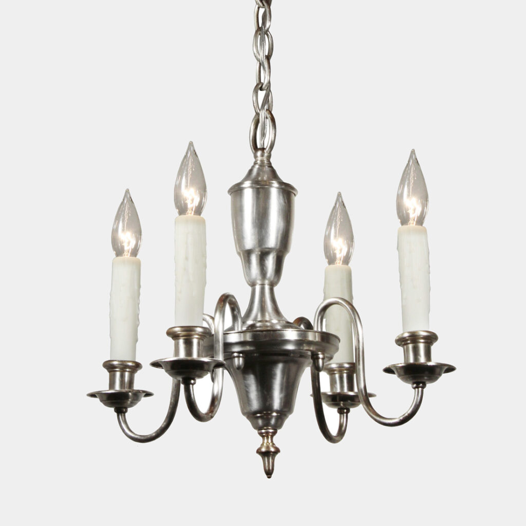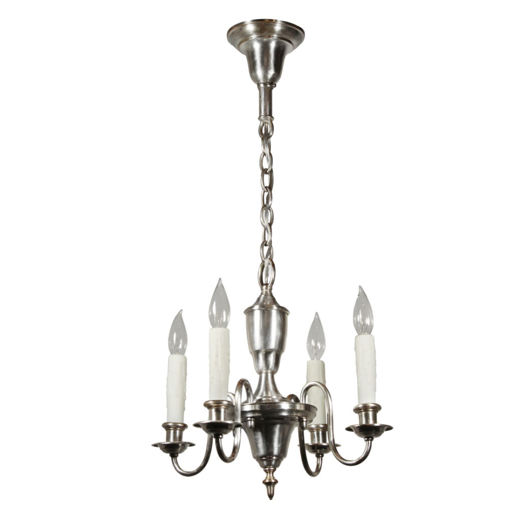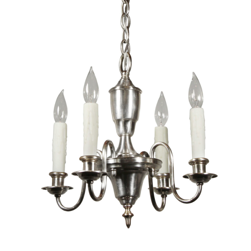 An elegant antique Neoclassical four arm silver-plated chandelier, c. 1915 and found in a home in Indianapolis, IN. The chandelier begins with an understated canopy that comes down in chain to an elegant urn-shaped body below; four S-shaped arms extend from the lamp body to support sleek candle cups and bobeches. The chandelier is in very good antique condition, and has some aging (as pictured). It has been professionally rewired and comes with all necessary attachments for modern installation. The chandelier measures approximately 12-1/2″ wide (square), 17-1/2″ wide (diagonally), 16″ tall, and 31-1/2″ long overall.