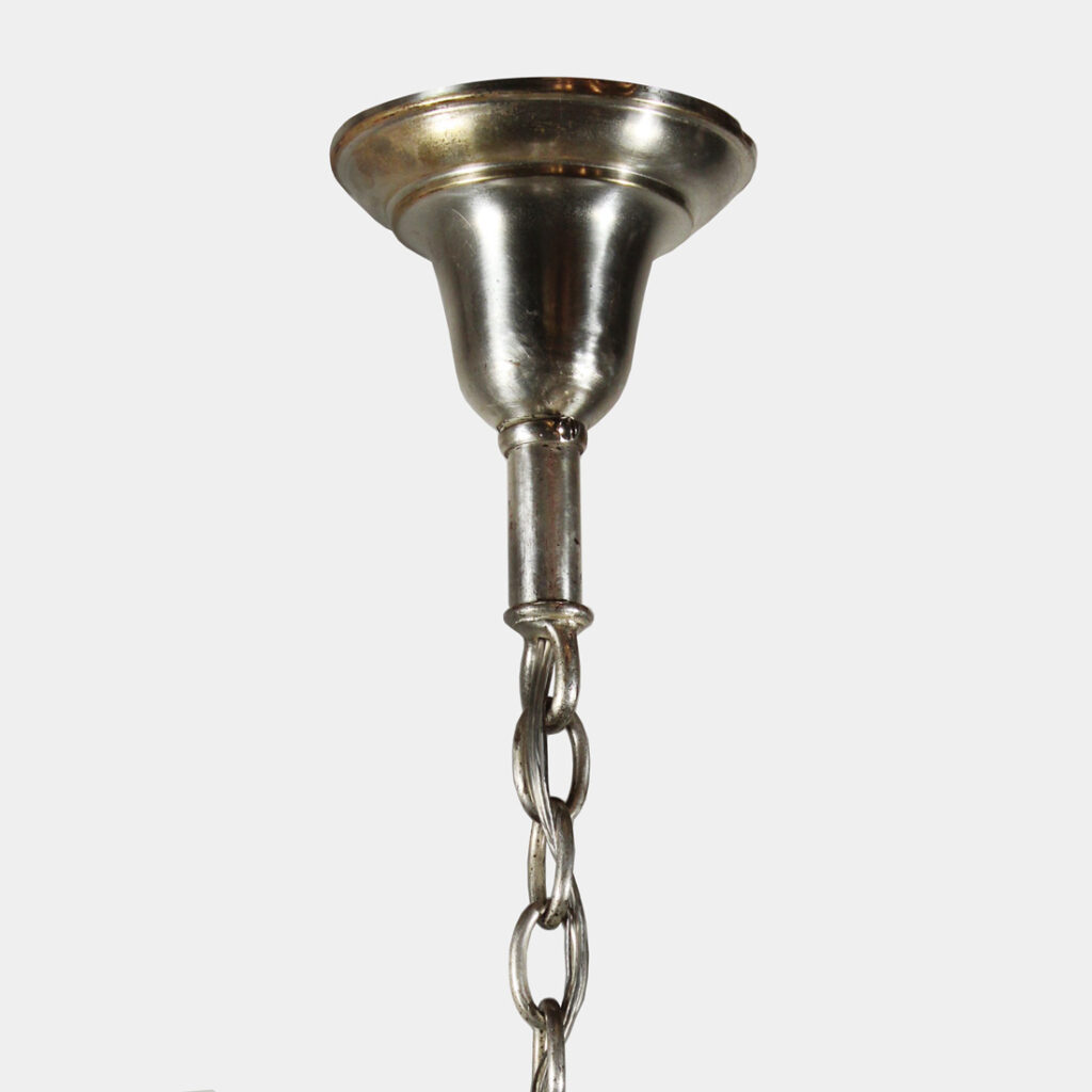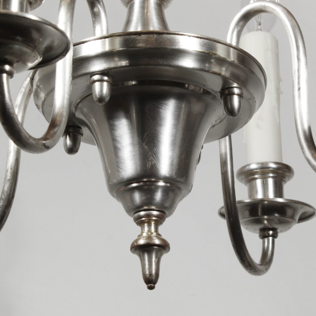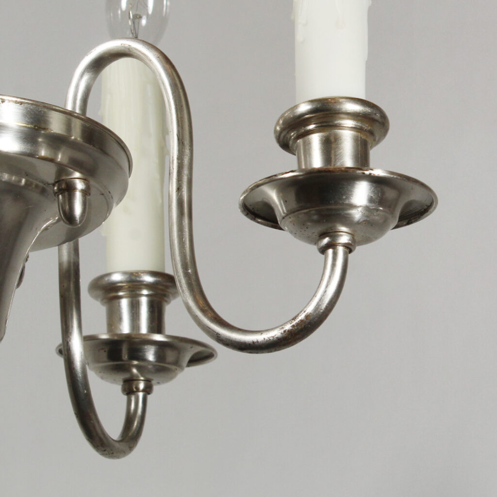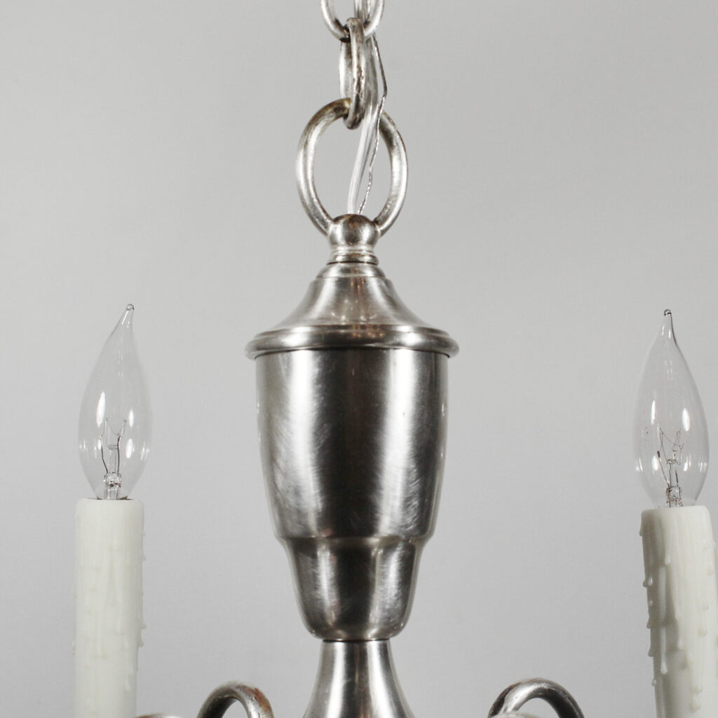 An elegant antique Neoclassical four arm silver-plated chandelier, c. 1915 and found in a home in Indianapolis, IN. The chandelier begins with an understated canopy that comes down in chain to an elegant urn-shaped body below; four S-shaped arms extend from the lamp body to support sleek candle cups and bobeches. The chandelier is in very good antique condition, and has some aging (as pictured). It has been professionally rewired and comes with all necessary attachments for modern installation. The chandelier measures approximately 12-1/2″ wide (square), 17-1/2″ wide (diagonally), 16″ tall, and 31-1/2″ long overall.