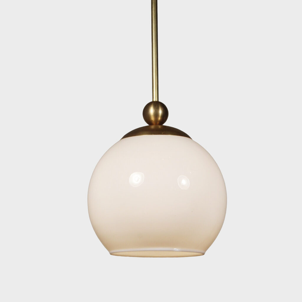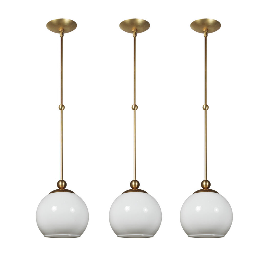 Beautiful matching antique brass pendant lights, dating from the early 1900’s. Each pendant light features a brass canopy that comes down in rod to a coordinating fitter that supports a white glass globe with an open bottom. Each light fixture is in excellent condition with no cracks or breaks to the glass, just the expected fleabites around the rims. They have been professionally rewired and come with all the necessary attachments for modern installation. Each light fixture measures 8” wide by 34-1/2” long overall. THE PRICE LISTED IS FOR EACH PENDANT LIGHT.
