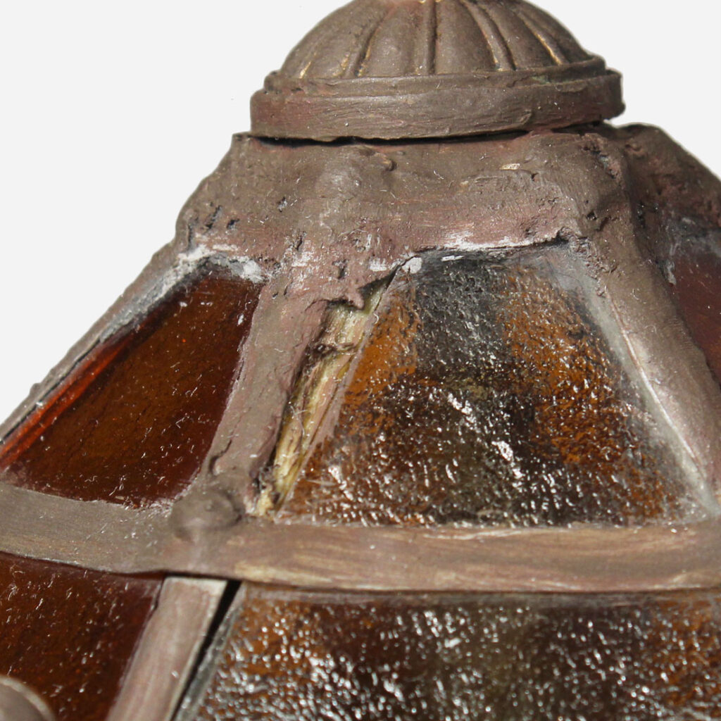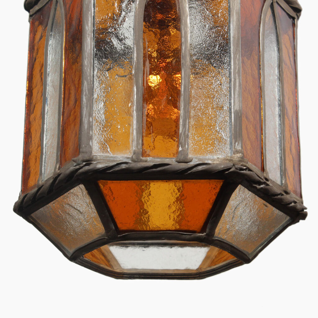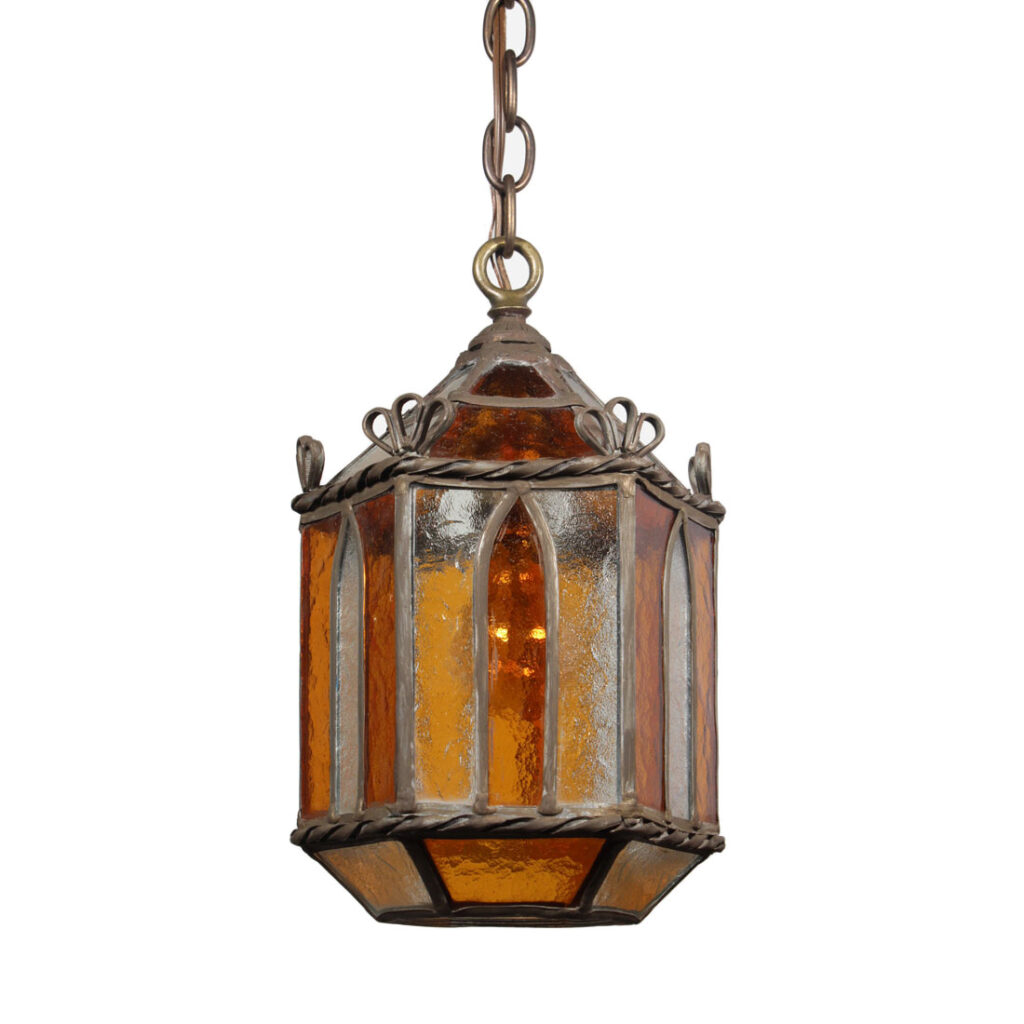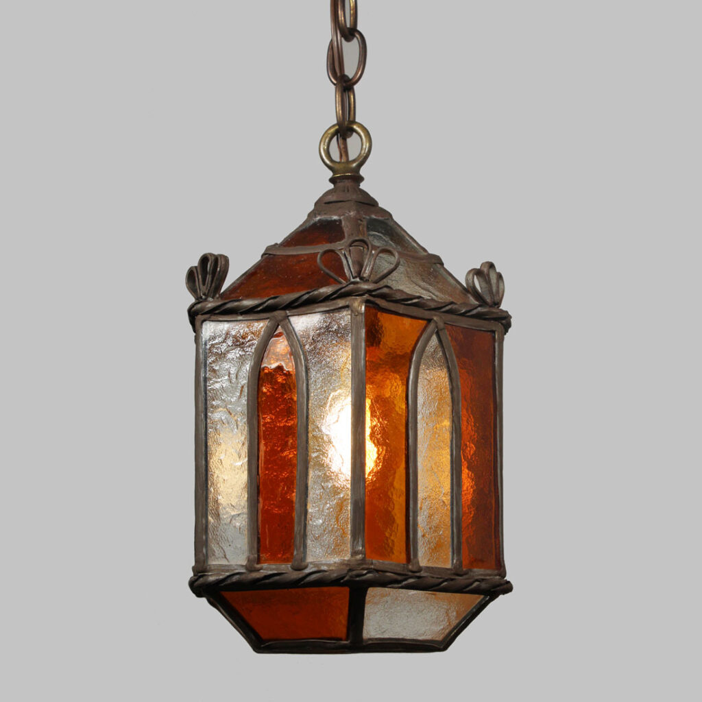 Wonderful antique lantern pendant with original glass, dating from the 1920’s. This charming pendant light begins with an understated canopy, coming down in a chain to a small loop finial which affixes to the roof of the fixture. Below, the pendant features panels of beautiful amber and clear textured glass. This fixture is in good antique condition with a small crack to the glass which does not detract from the beauty of the fixture (pictured). It has been professionally rewired and comes with all necessary attachments for modern installation. The lantern measures 7-1/2” wide by 12” tall, and is 27-1/2” overall.
