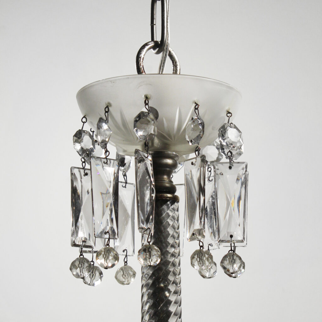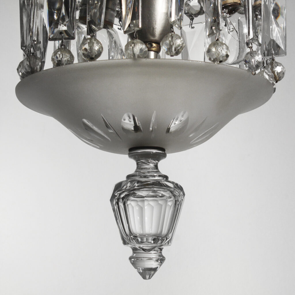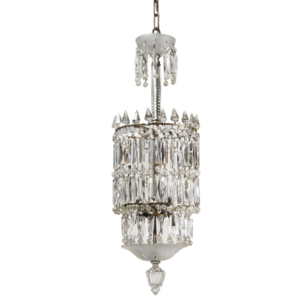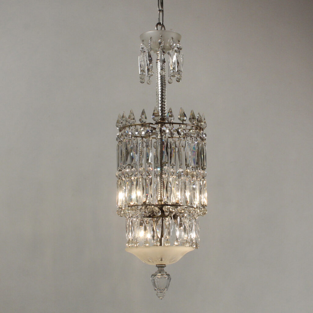 A stunning antique five-light pendant with sparkling prisms, salvaged from the historic “Windsor” home—also known as the Castle Above the Clouds—perched atop Lookout Mountain, Tennessee. Built in the 1930s by George and Elizabeth Scholze, the residence reflects the couple’s refined taste and attention to detail. George Scholze, second-generation owner of the prominent Scholze Tannery in Chattanooga, helped earn the city its nickname, “Saddle Capital of the World.”