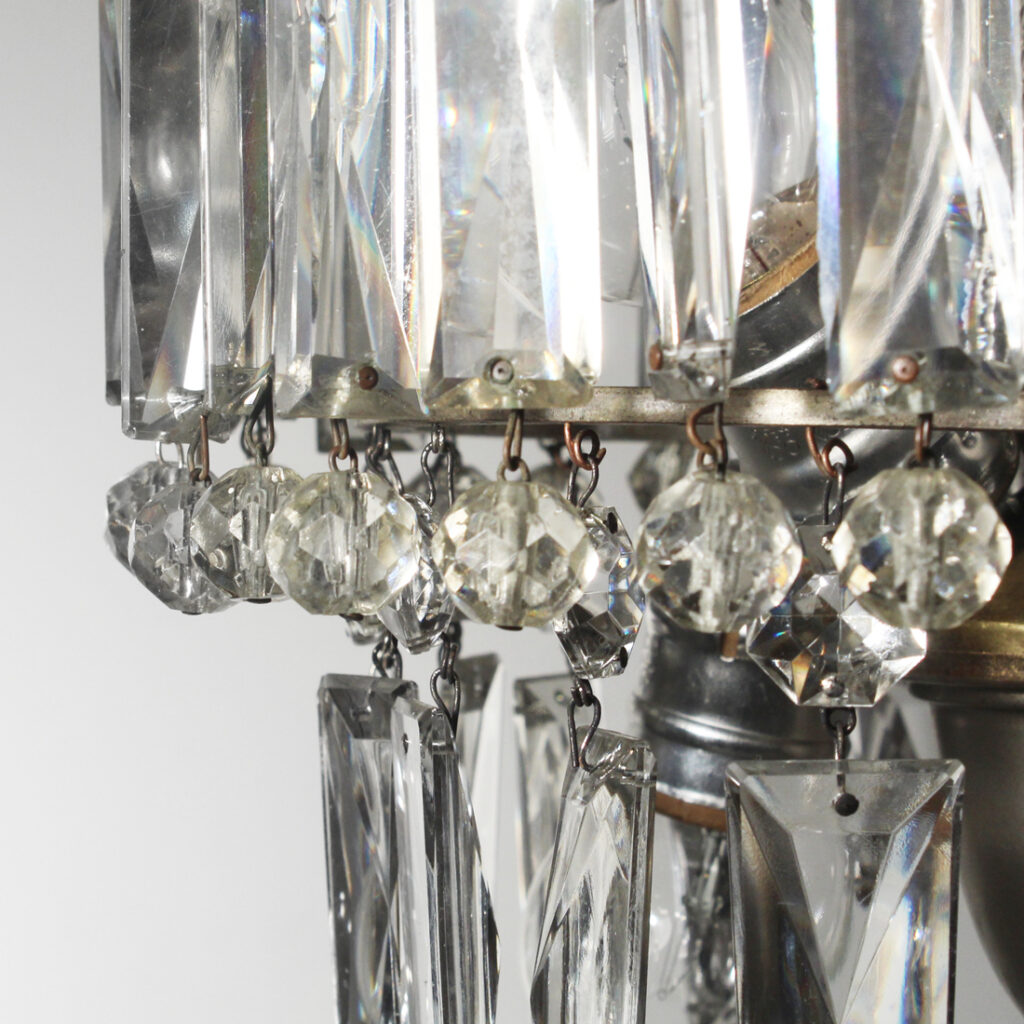 This light fixture is in excellent condition with just a few chips to the prisms (as pictured), has been professionally rewired, and comes with all the necessary attachments for modern installation. The chandelier body measures approximately 12″ wide, 35-1/2″ tall (body), and 49″ long overall.