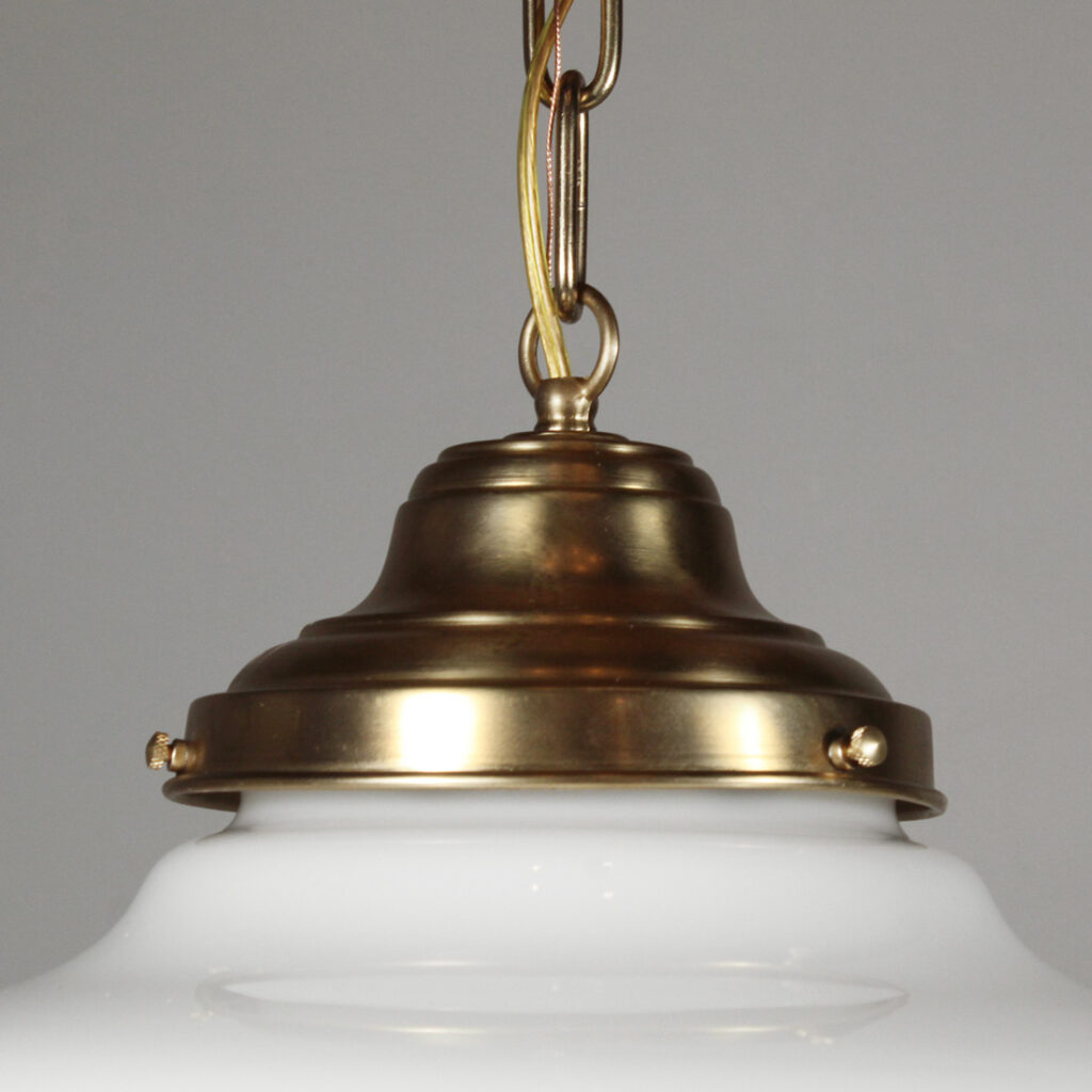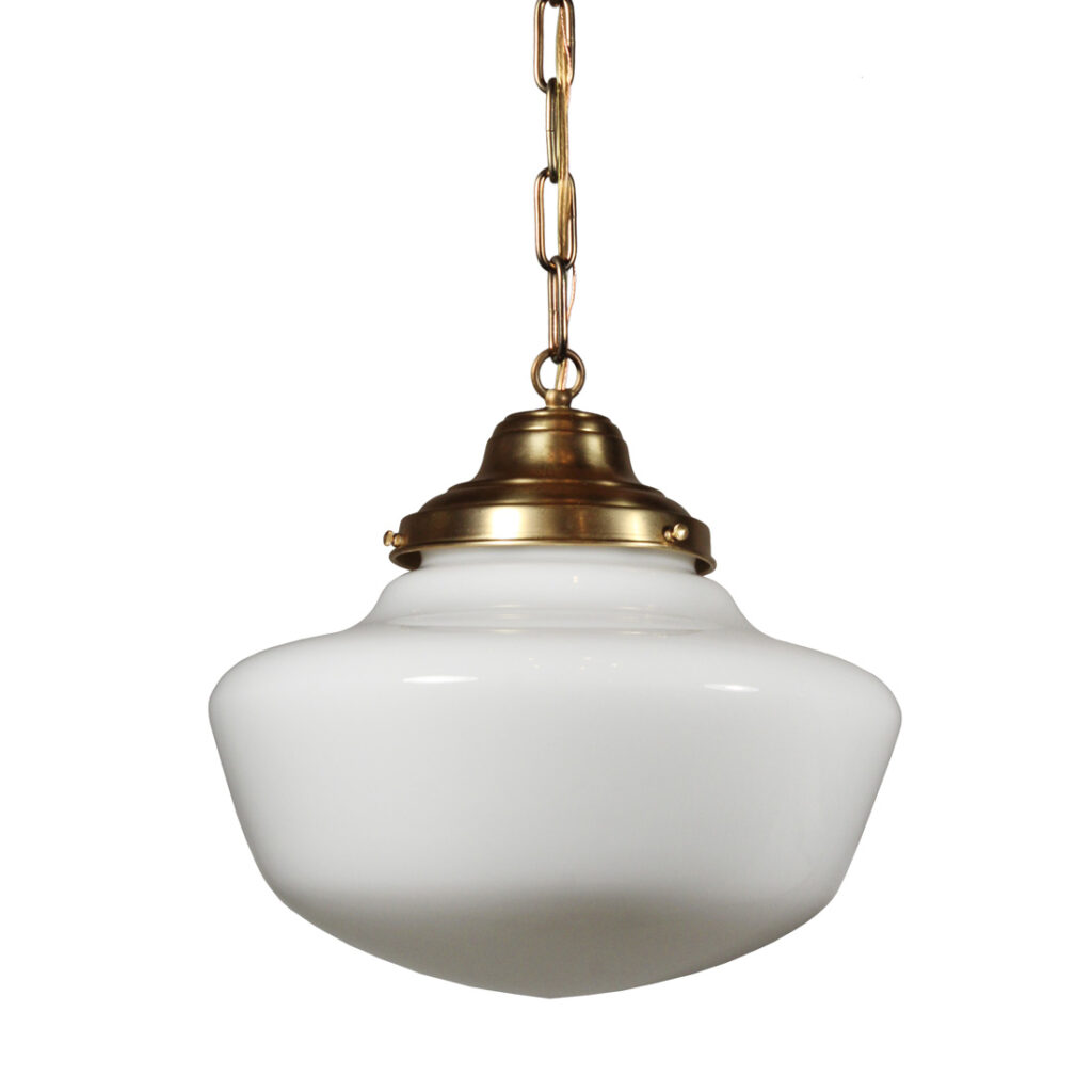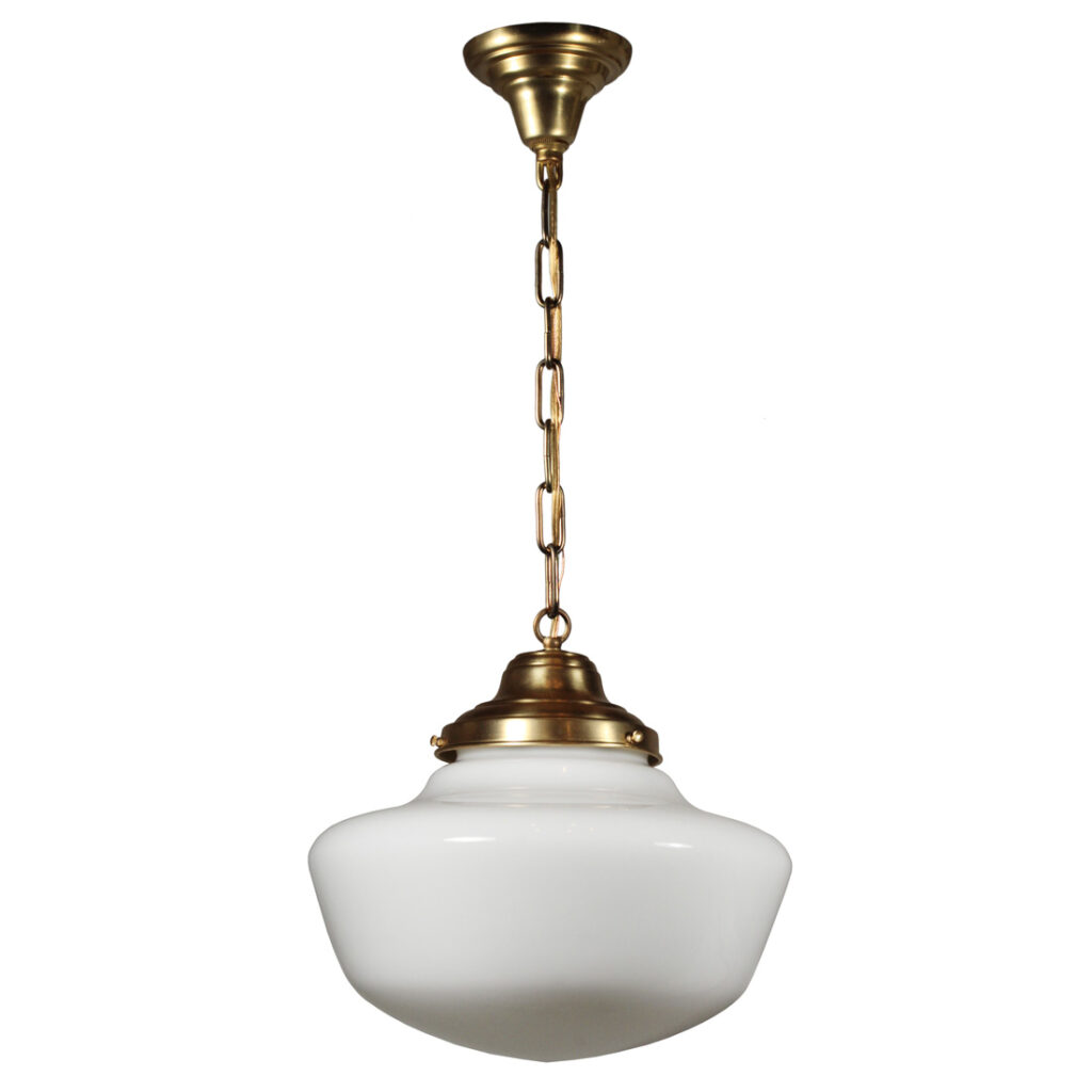A charming antique school house pendant light with its original glass shade, dating from the early 1900’s and salvaged out of a home in Ohio. The pendant light features a brass canopy that comes down in chain to a simple fitter and white glass globe below. These light fixture is in great condition with no cracks or breaks to the glass, just the expected fleabites around the rim. The chandelier has been professionally rewired and comes with all the necessary attachments for modern installation. The light fixture measure 14” wide by 13″ tall (body only), and 30” overall height.