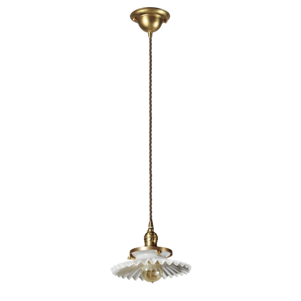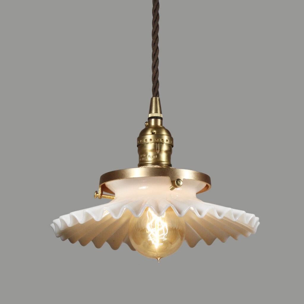 Whimsical antique pendant lights with glass shades, dating from the early 1900’s. Each fixture begins with an understated brass canopy that comes down in twisted chord to meet the complimentary fitter and ruffle glass shade below. These pendant lights are in excellent condition with no cracks or breaks to the glass. They have been professionally rewired and come with all the necessary attachments for modern installation. Each fixture measures 8″ wide, 5-1/4″ tall (body), and are 30″ long overall. THE PRICE LISTED IS FOR EACH FIXTURE.