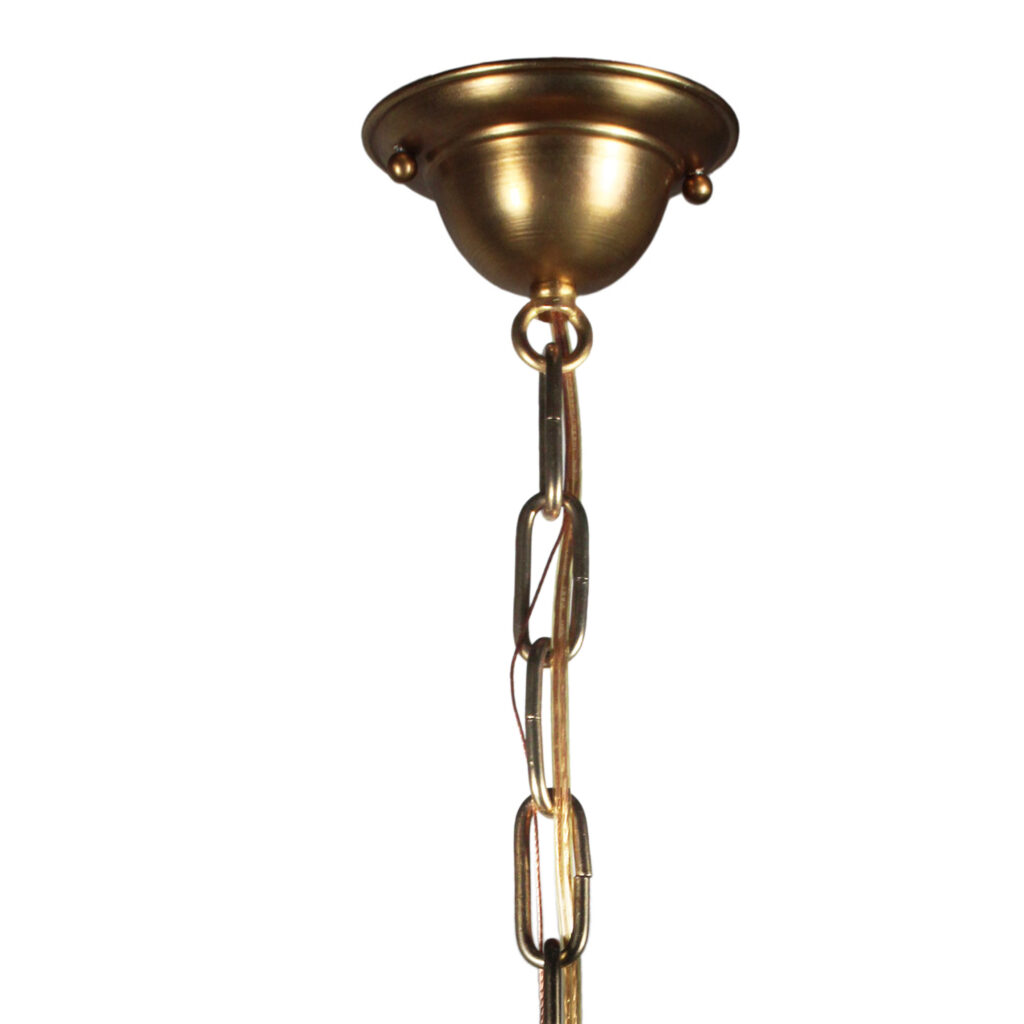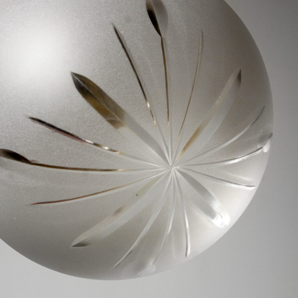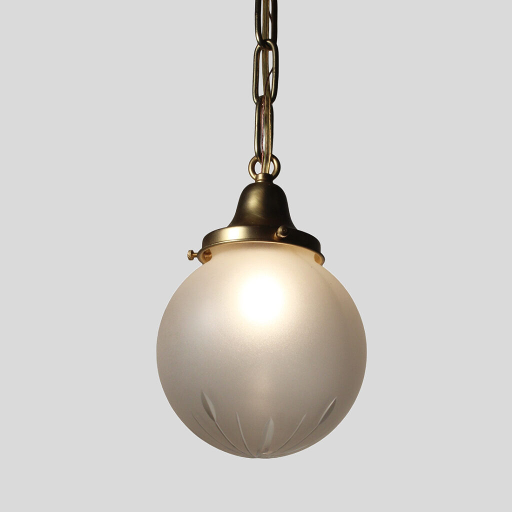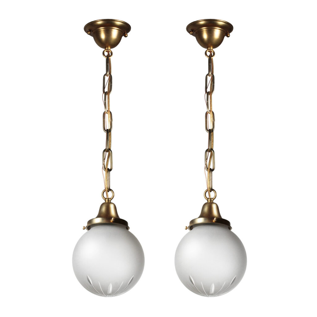 Darling antique pendant lights with their original frosted glass shades, dating from the 1920’s and featuring a darling wheel-cut design. They are in very good antique condition with no cracks or chips to the glass, just the expected flea bites around the rim; one of the shades has a stain (pictured) which does not detract from the beauty of the fixture. Each light has been professionally rewired and comes with all the necessary attachments for modern installation; they each measure 6” wide, 9″ tall, and 24-1/4″ long overall. THE PRICE LISTED IS FOR EACH FIXTURE.