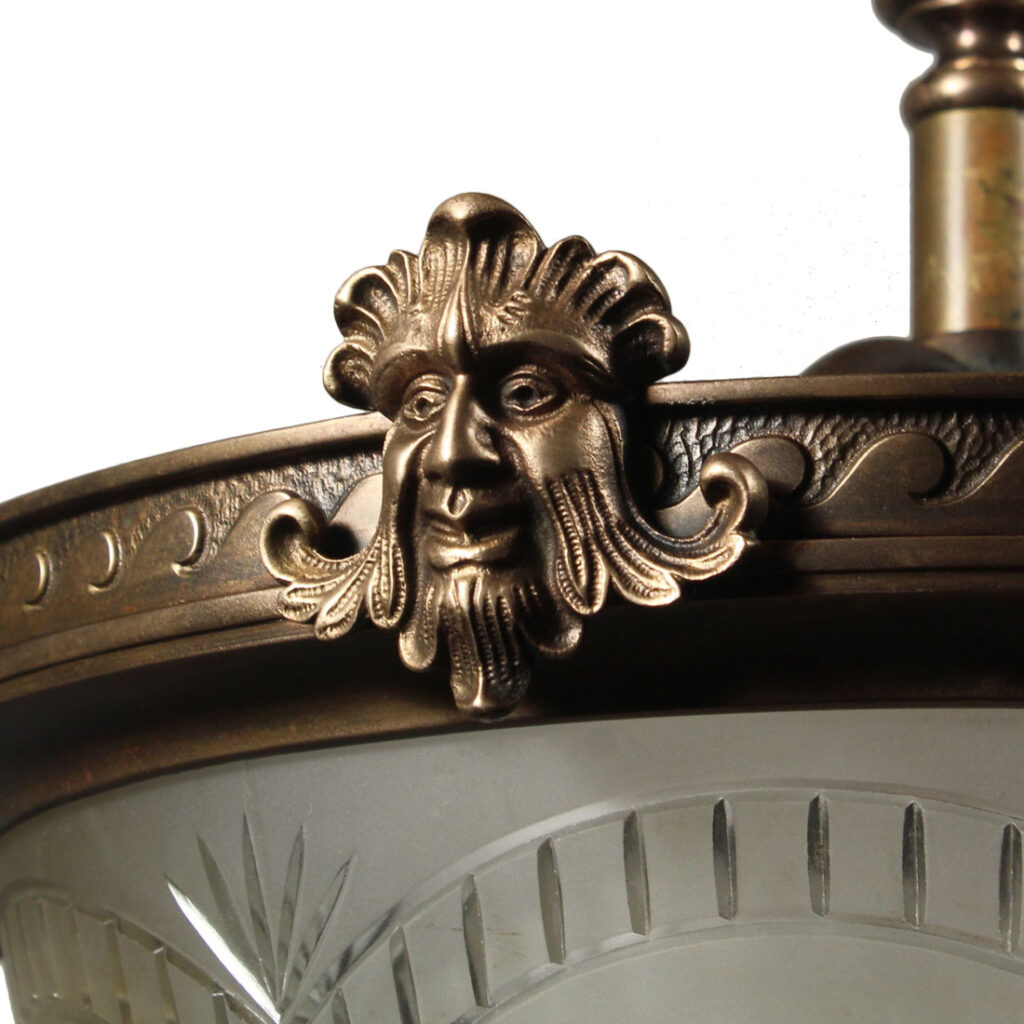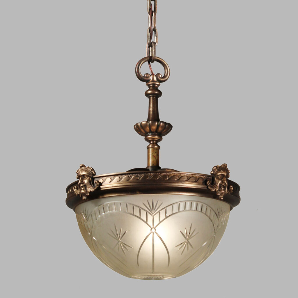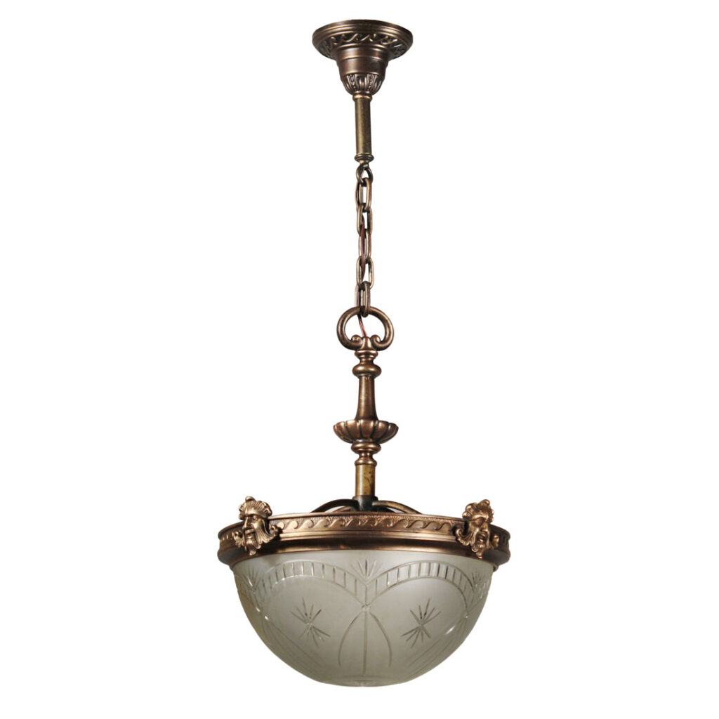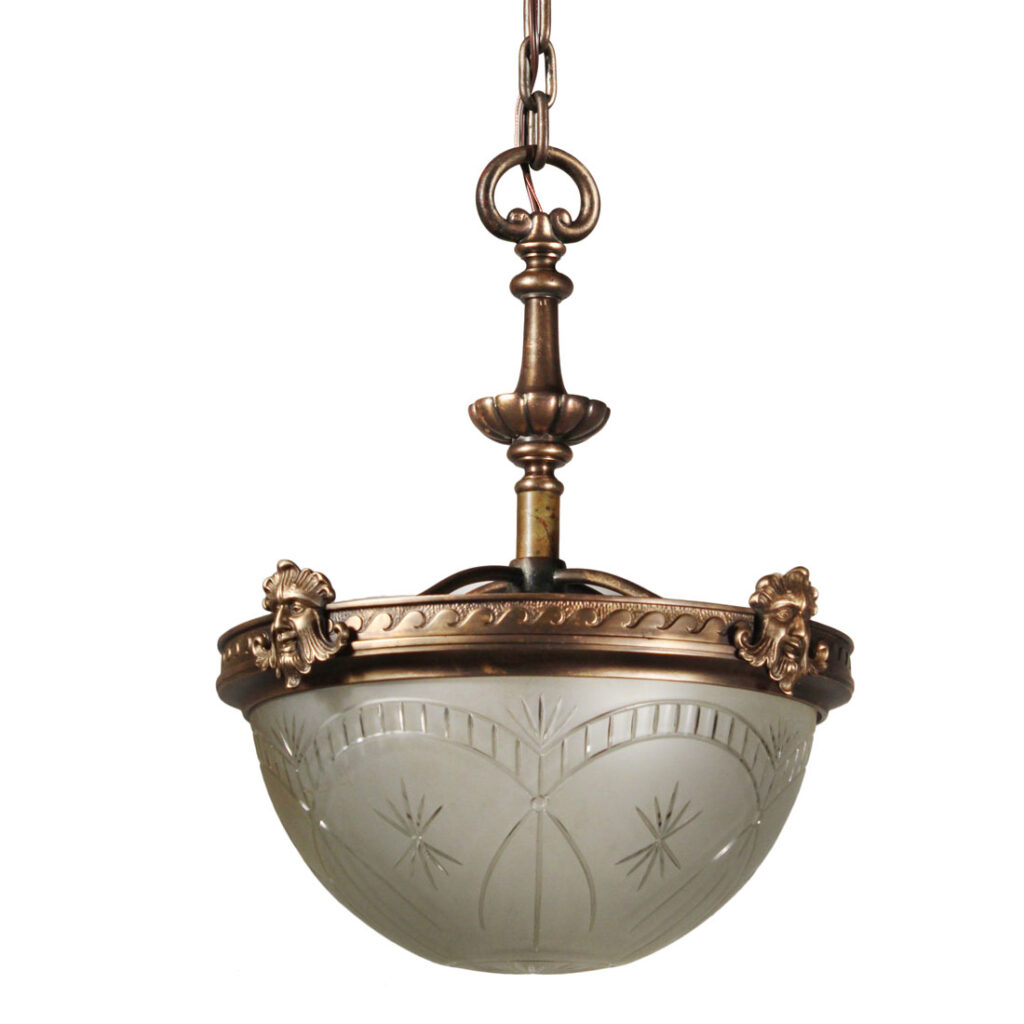 An incredible antique figural inverted dome chandelier by Handel, dating from the 1900s. This light fixture begins with an elegant canopy, descending in chain to meet a volute loop finial and baluster; the baluster attaches to framework which supports a band ornamented with beautifully cast leaf masks and wave scroll detail; the ring supports the fixture’s decorative cut glass shade. This rare light fixture is in excellent condition with no cracks or breaks to the glass, just the expected fleabites around the edges and a few scuffs which do not detract from the beauty of the light (as pictured). It has been professionally rewired and comes with all the necessary attachments for modern installation. The chandelier measures 14-1/2″ in diameter, 18″ tall, and 31-1/2″ long overall.