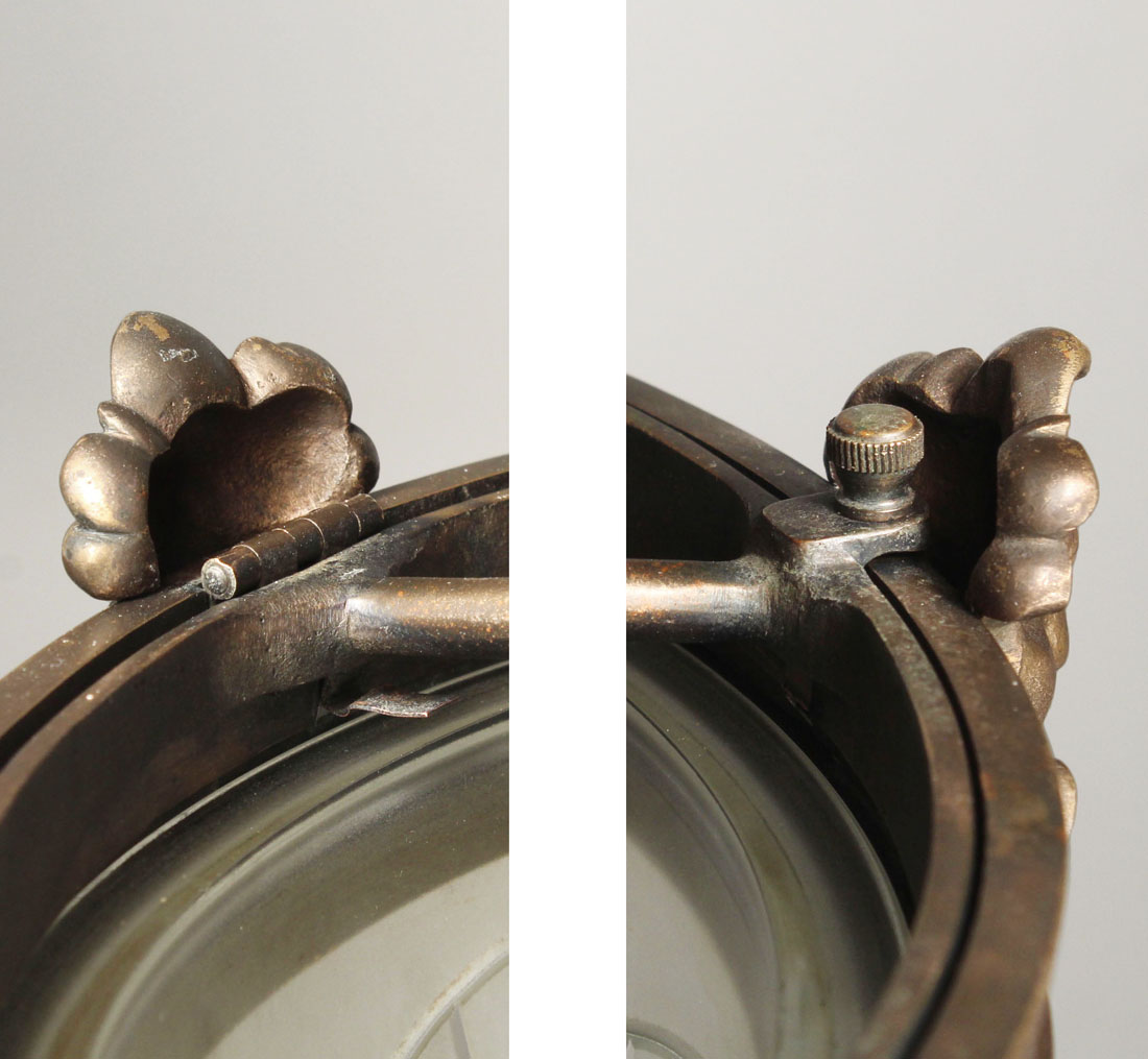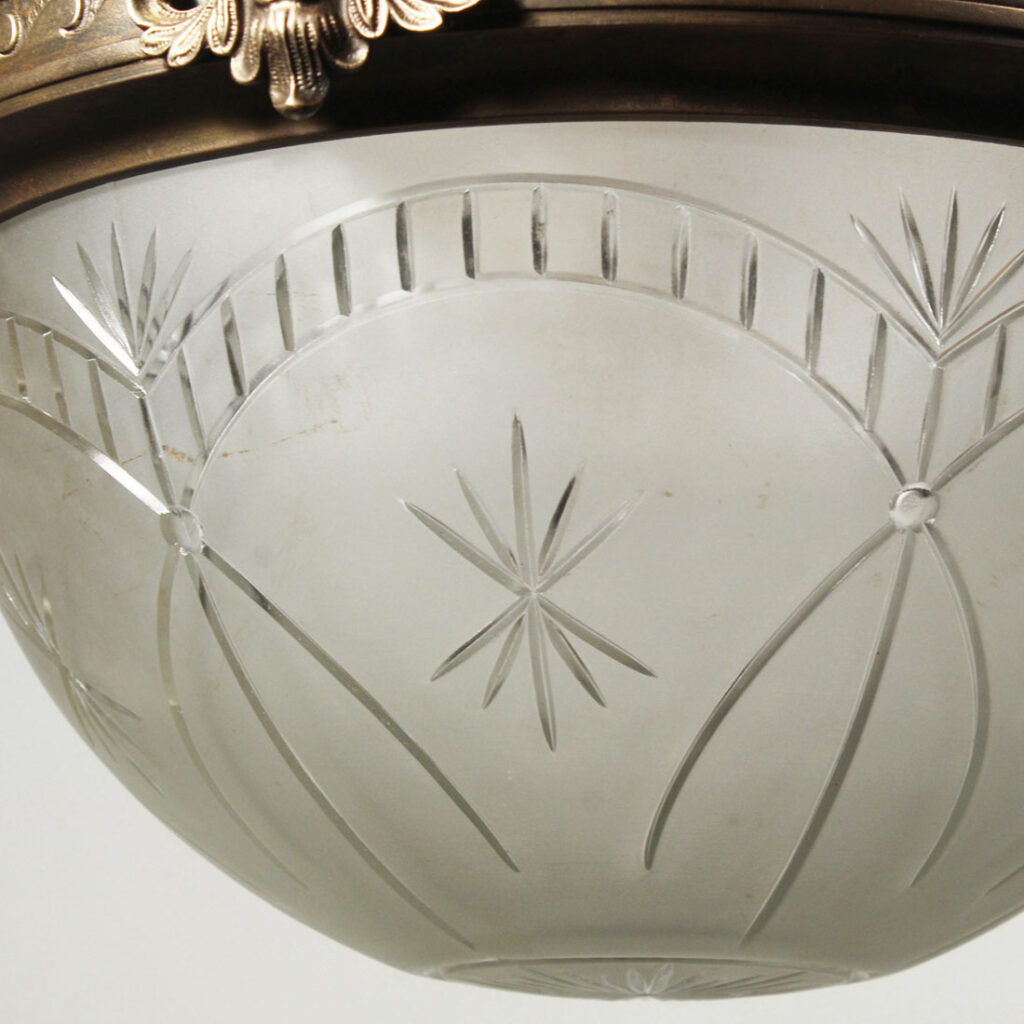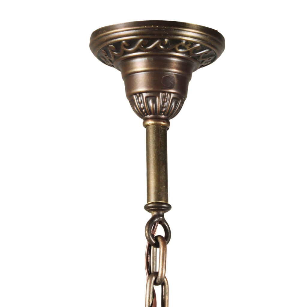An incredible antique figural inverted dome chandelier by Handel, dating from the 1900s. This light fixture begins with an elegant canopy, descending in chain to meet a volute loop finial and baluster; the baluster attaches to framework which supports a band ornamented with beautifully cast leaf masks and wave scroll detail; the ring supports the fixture’s decorative cut glass shade. This rare light fixture is in excellent condition with no cracks or breaks to the glass, just the expected fleabites around the edges and a few scuffs which do not detract from the beauty of the light (as pictured). It has been professionally rewired and comes with all the necessary attachments for modern installation. The chandelier measures 14-1/2″ in diameter, 18″ tall, and 31-1/2″ long overall.