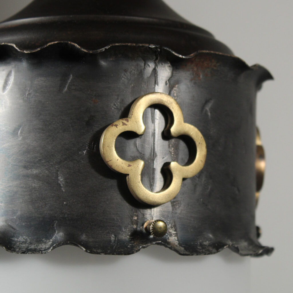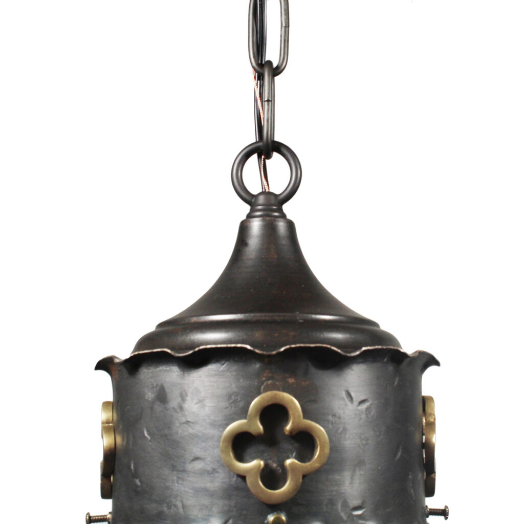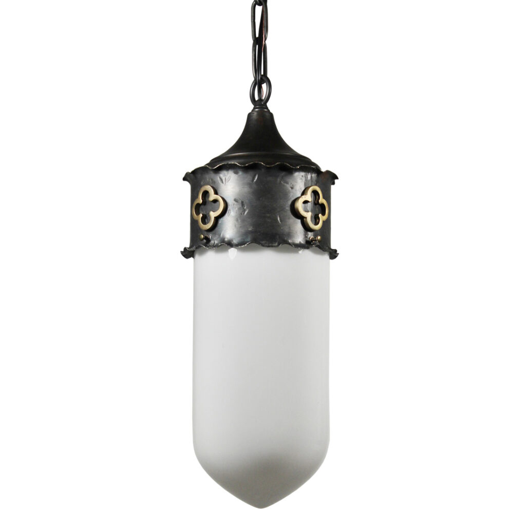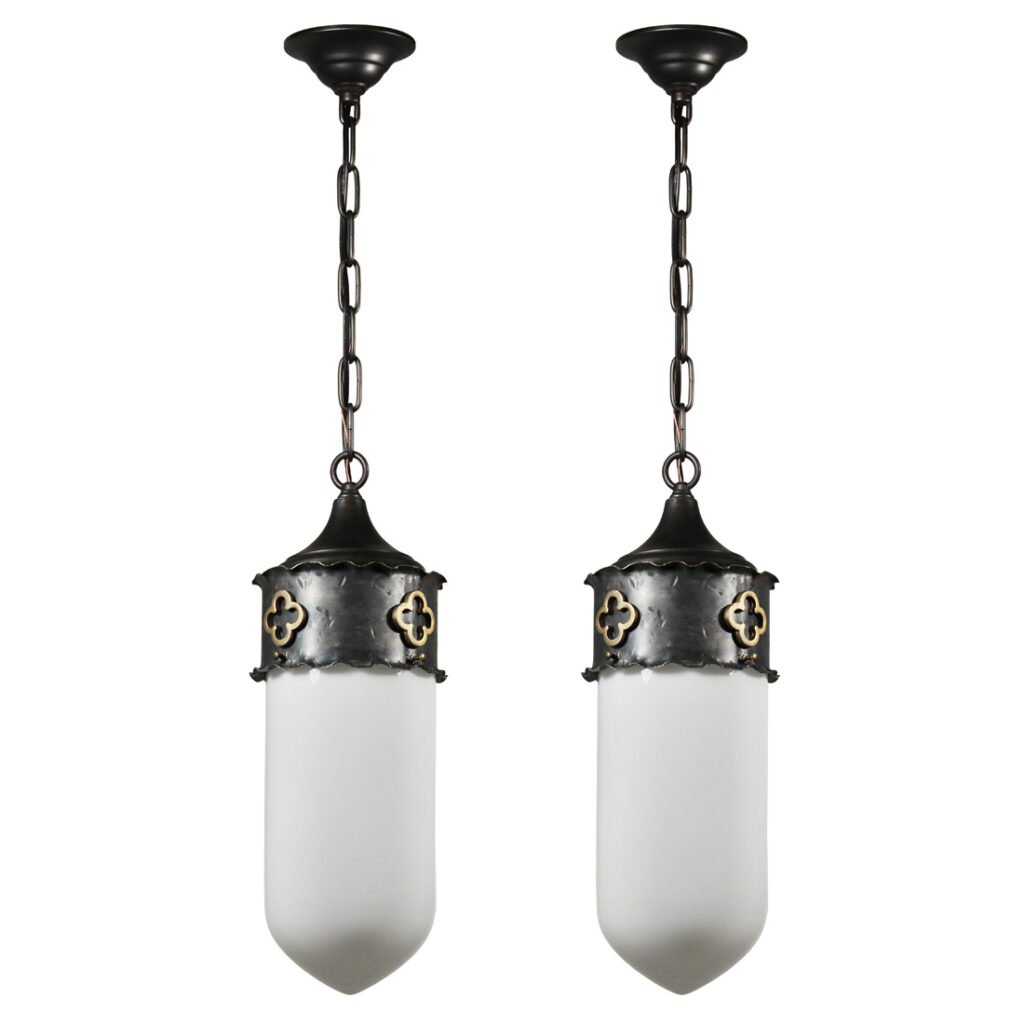 Incredible matching antique Gothic Revival pendant lights, found in a home in Columbus, OH. Each pendant light features an understated canopy that comes down in chain to a pie-crust edged fitter embellished with quatrefoils, and a slender bullet-shaped shade below. These light fixtures are in excellent condition, and the glass is in very good condition with the expected fleabites around the rims (as pictured). They have been professionally rewired and come with all the necessary attachments for modern installation. Each light fixture measures 7-1/2” wide, 19-1/2” tall (body only), and 34-1/2″ long overall. THE PRICE LISTED IS FOR EACH LIGHT FIXTURE.
