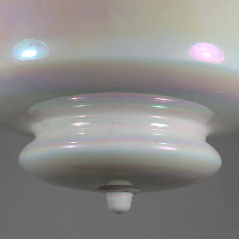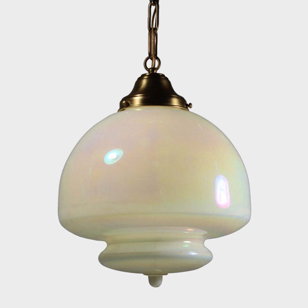 An incredible vintage pendant light with an unusual glass shade found in a home in Mississippi. The light, originally “new/old stock”, begins with an understated canopy descending in chain to meet a sleek brass fitter; the fitter supports a remarkable opalescent clear glass shade. This light fixture is in excellent condition; the shade is also in very good condition with no chips or cracks, just the expected fleabites around the rim. It has been professionally rewired and comes with all the necessary attachments for modern installation. It measures 12″ wide, 15-1/4″ tall, and 32-1/4″ in overall height.