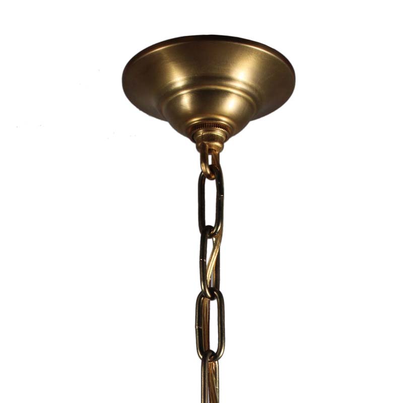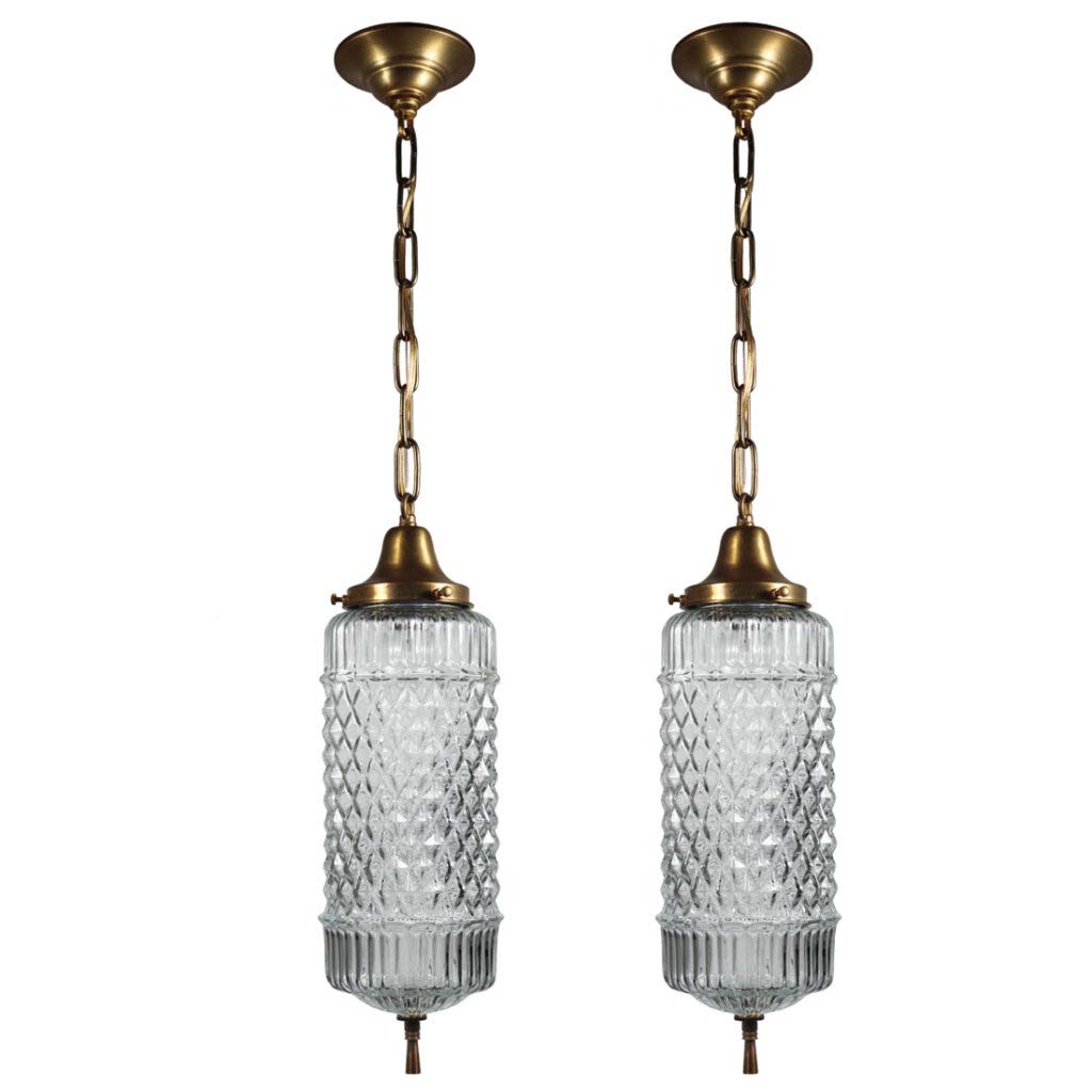 Lovely vintage pendant lights with original glass shades found in a home in Charlotte, NC. The lights begin with an understated canopy descending in chain to meet a sleek brass fitter; the fitter supports a cylindrical molded glass shade. These light fixtures are in excellent condition; the shades are also in very good condition with no chips or cracks, just the expected fleabites around the rim. The chandeliers have been professionally rewired and come with all the necessary attachments for modern installation. The fixtures measure 5-1/2″ wide, 17″ tall, and 32″ long overall. THE PRICE LISTED IS FOR EACH PENDANT LIGHT; ONE AVAILABLE.