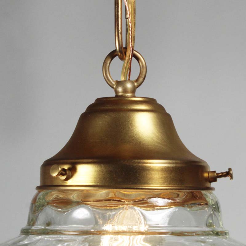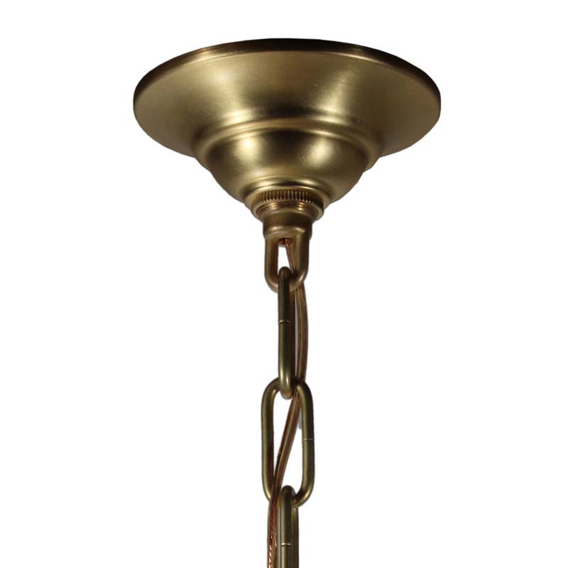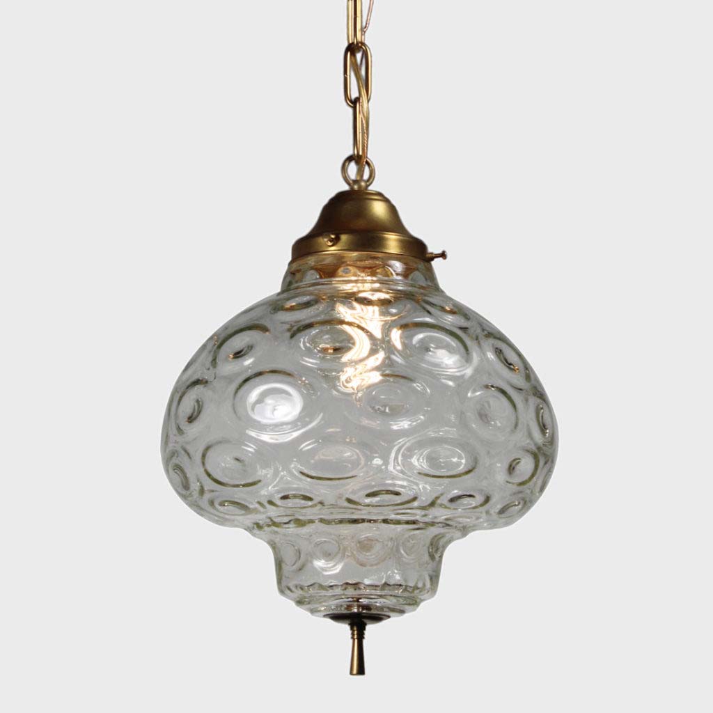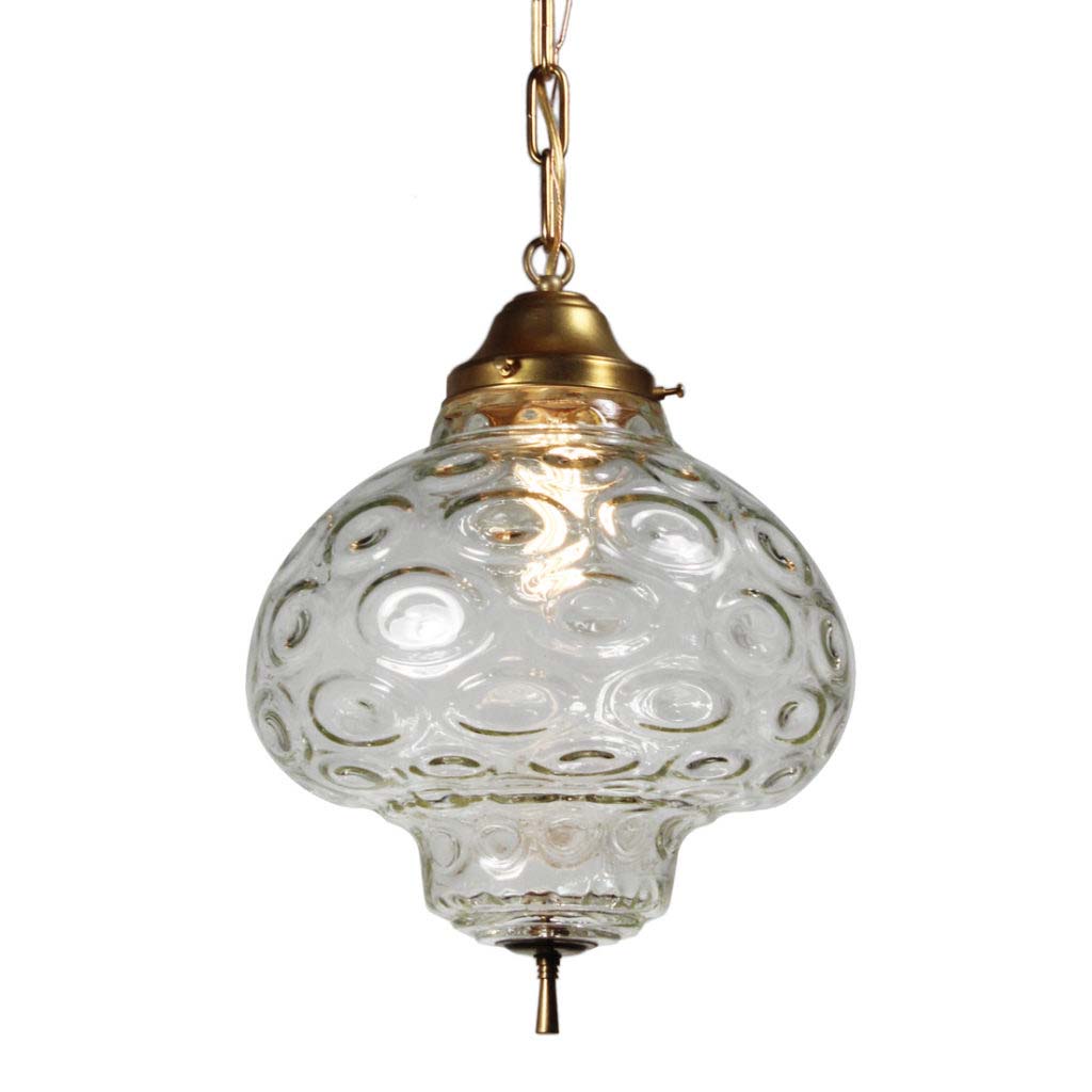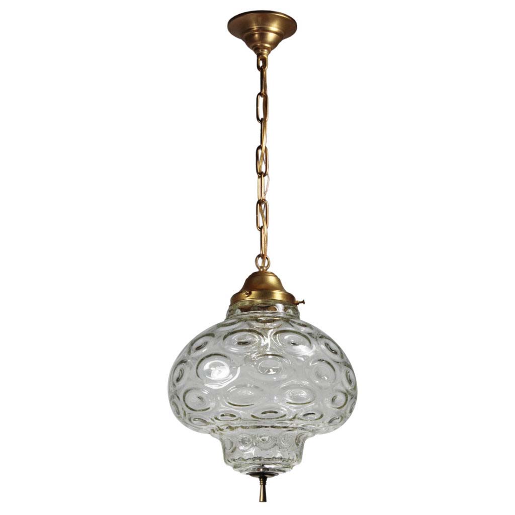Amazing vintage pendant light with unusual glass shades found in a home in Frankfurt, KY. The light begins with an understated canopy descending in chain to meet a sleek brass fitter; the fitter supports a remarkable molded glass shade. This light fixture is in excellent condition; the shade is also in very good condition with no chips or cracks, just the expected fleabites around the rim. The chandelier has been professionally rewired and comes with all the necessary attachments for modern installation. The fixture measures 12″ wide, 17″ tall, and 32″ in overall height.