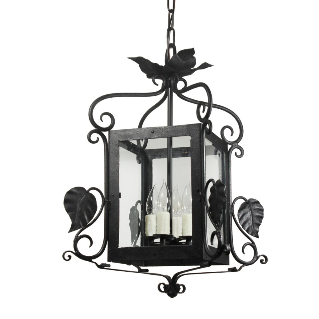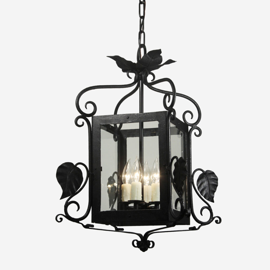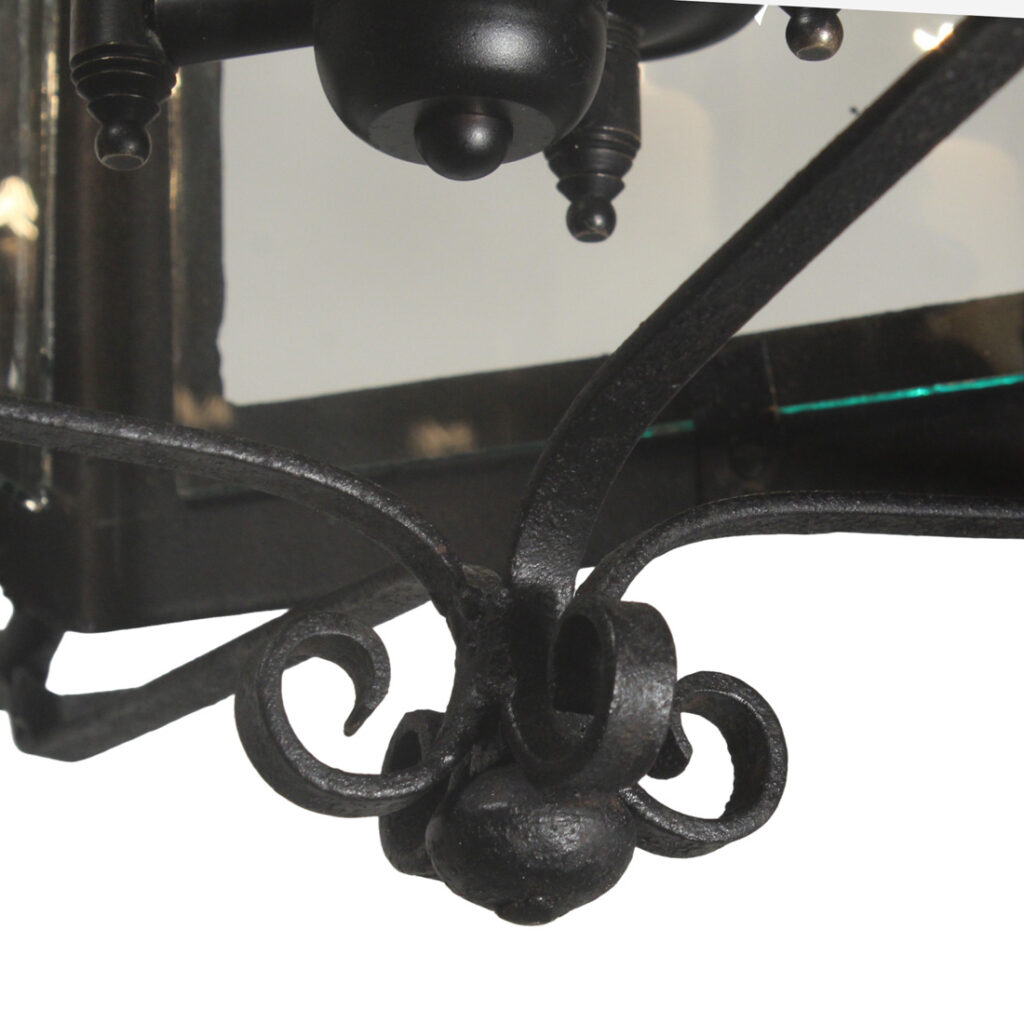 These light fixtures are in excellent antique condition, and the clear glass panels are also in good condition with fleabites (pictured). They have been professionally rewired and come with all the necessary attachments for modern installation. Each light measures 15-1/4″ wide (square), 22″ wide (diagonally), 26″ tall, and 45″ long overall. THE PRICE LISTED IS FOR EACH LANTERN.