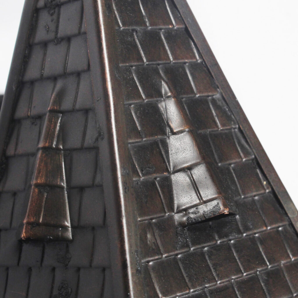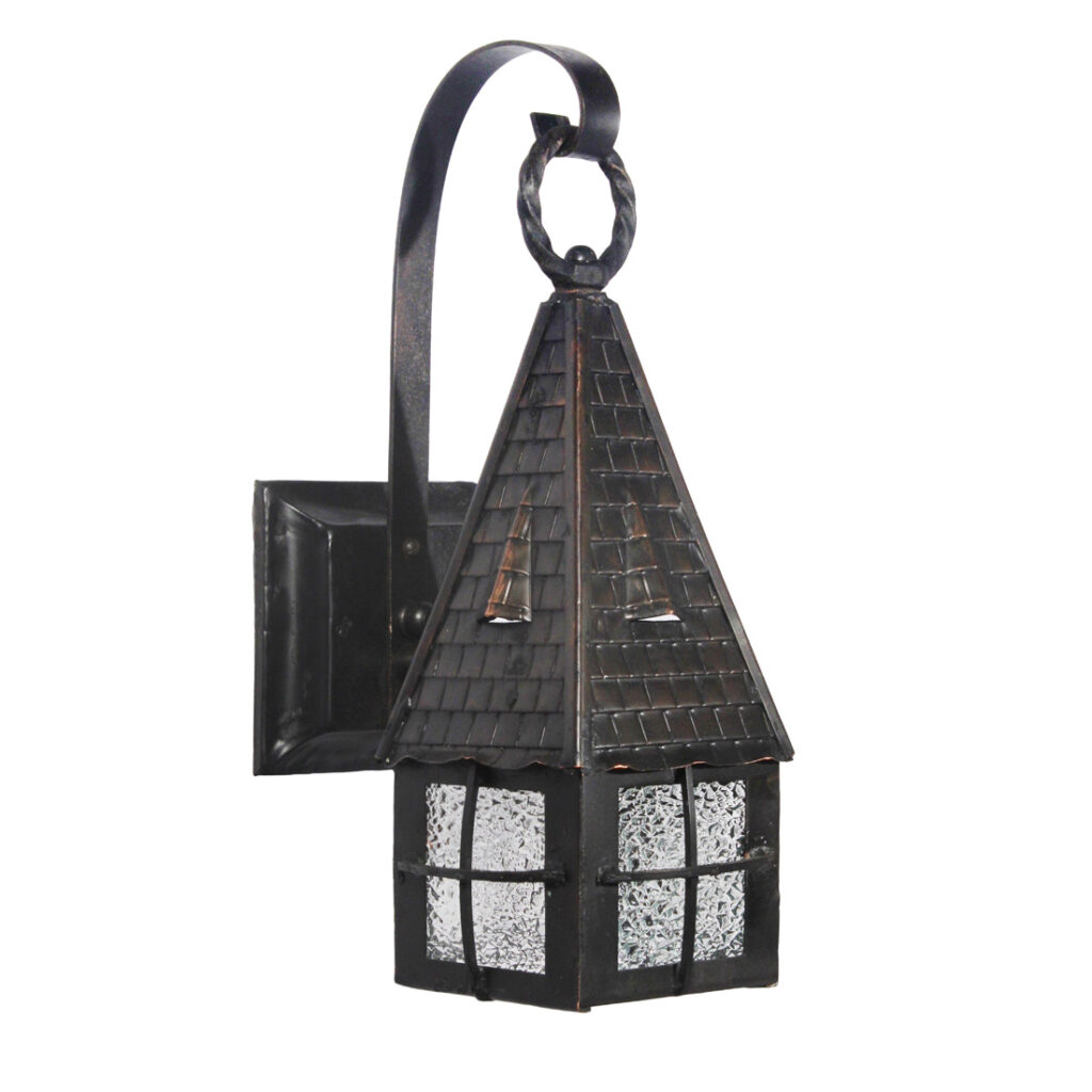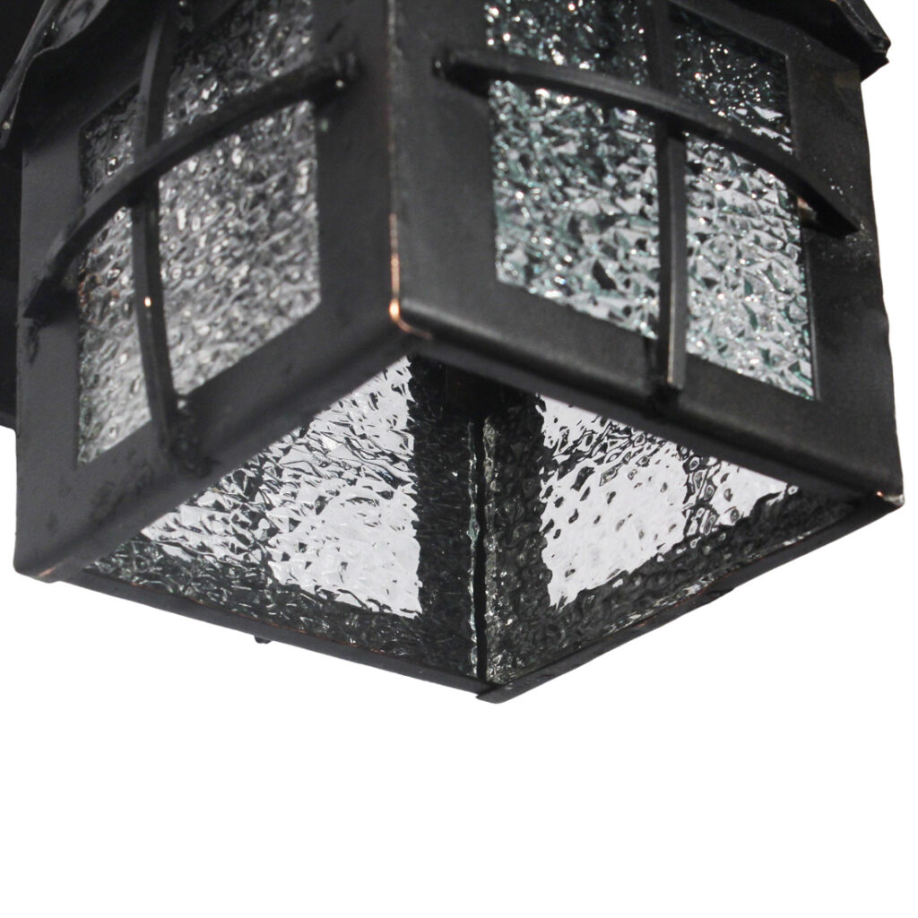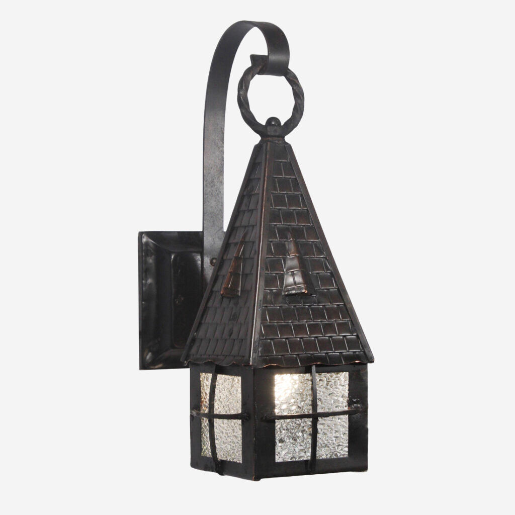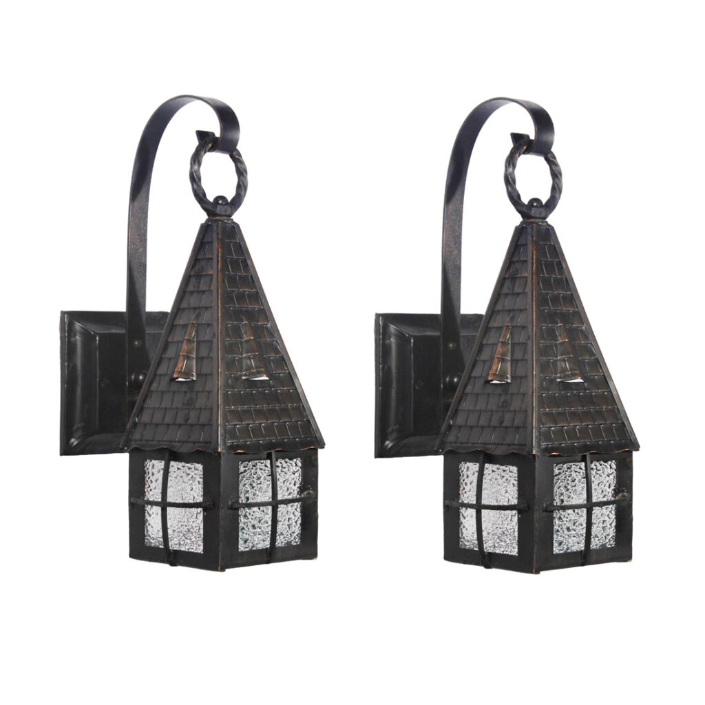 Each wall lamp begins with a beveled, square back plate from which an arm curls outward to support a lantern body. The lantern body is crowned with a tall, pyramidal roof with ridge cap shingle detailing; the body below features divided metal framework which allows its textural, granite glass panes to peek through. The lanterns have been professionally rewired and come with all the necessary attachments for modern installation. Each sconce measures 5” wide, 14″ tall, and projects 7-1/2” from the wall.