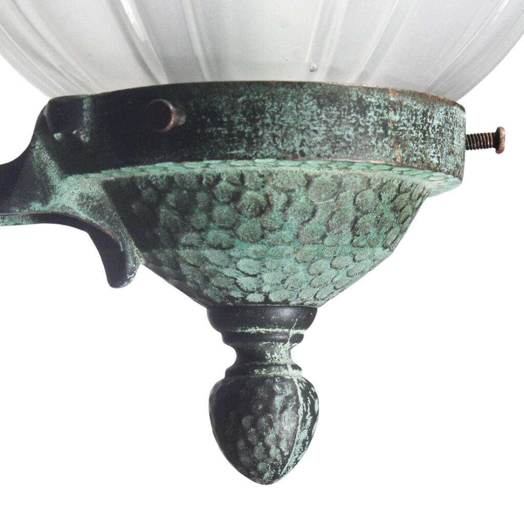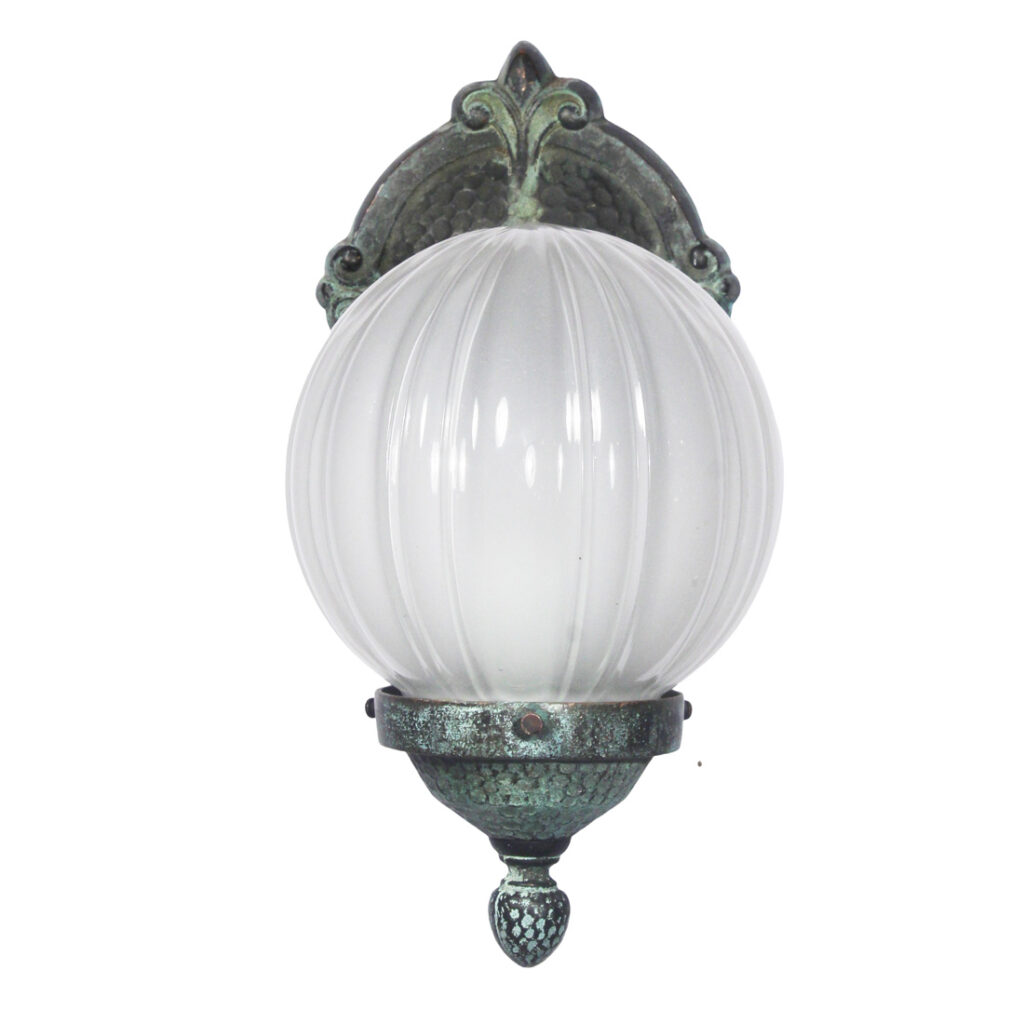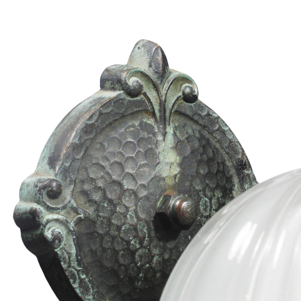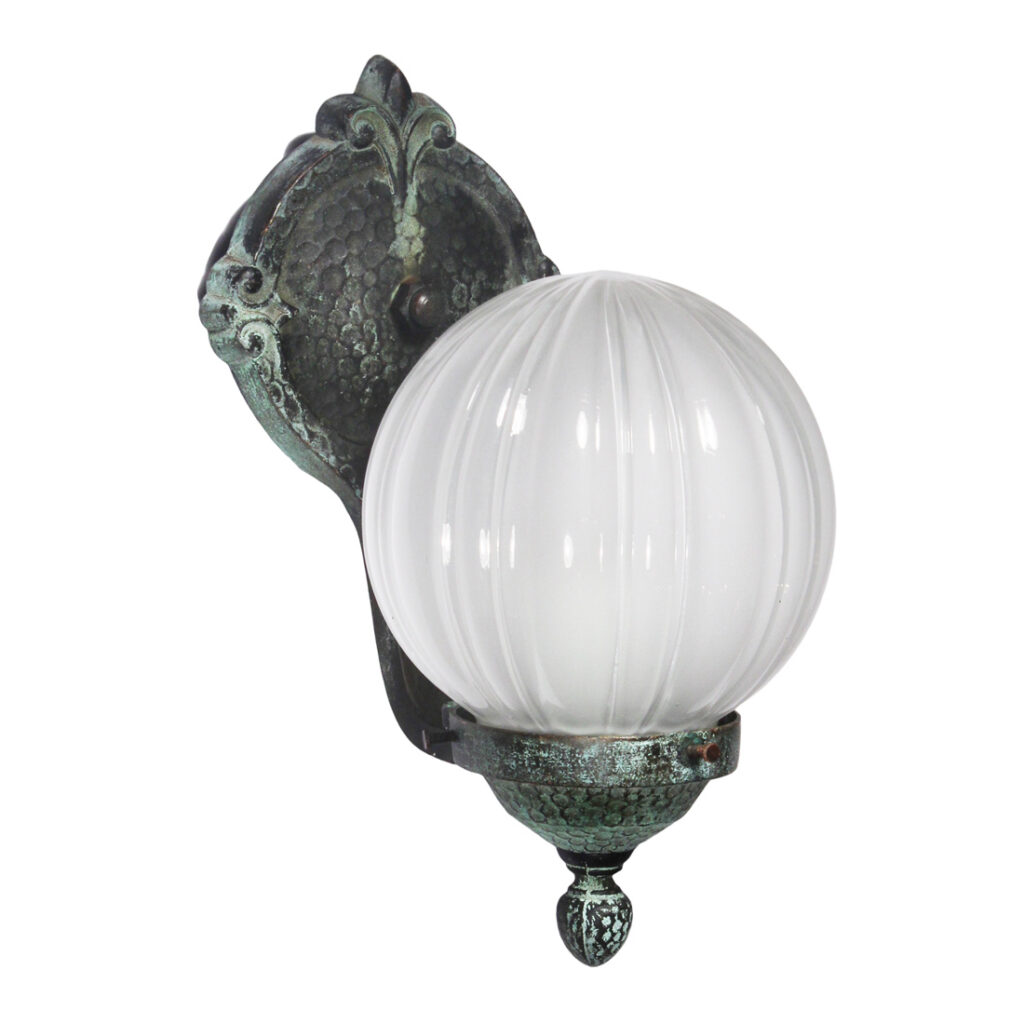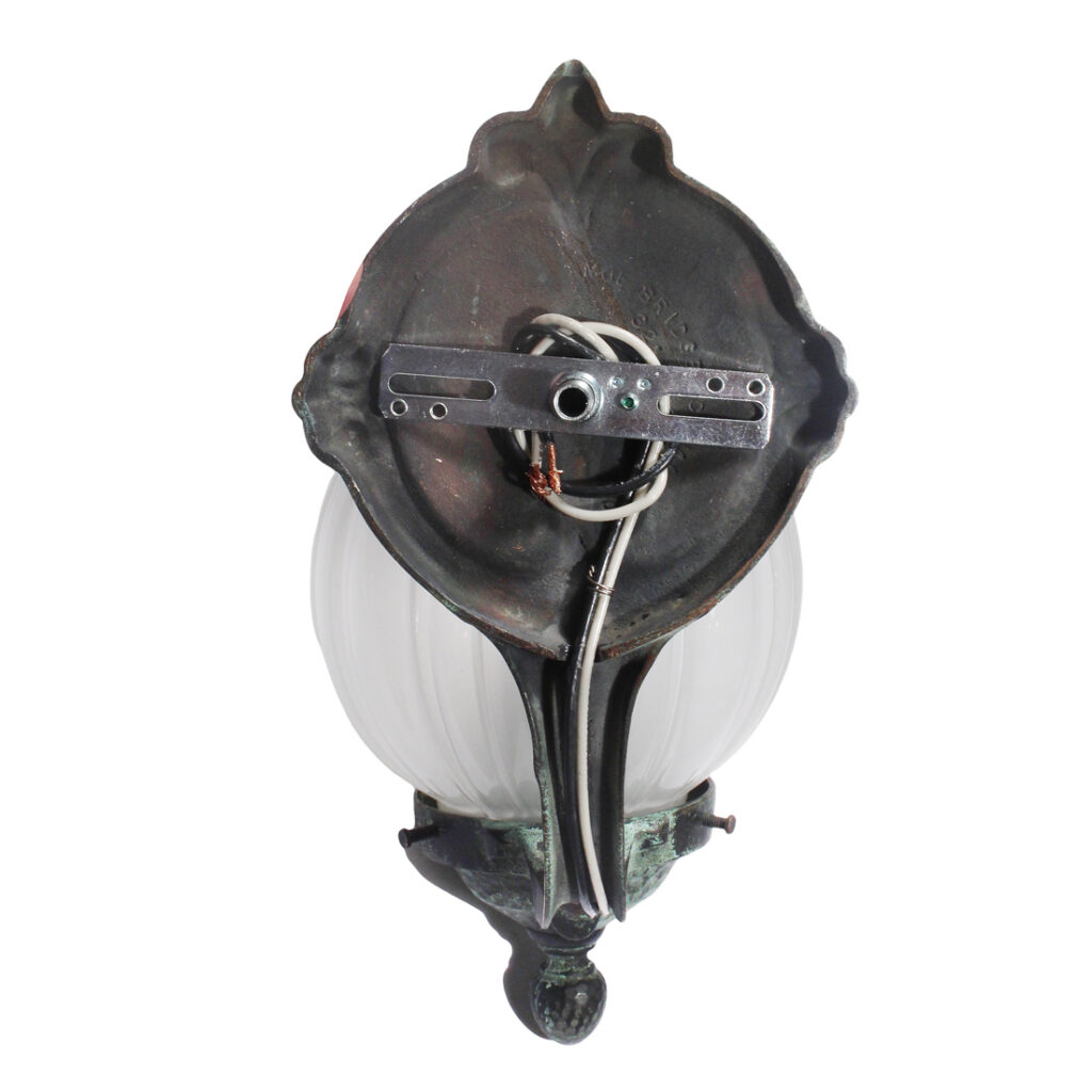 Wonderful antique cast bronze single-arm sconce with glass shade, signed Moe Bridges and dating from the early 1900s. This sconce features a textured bronze backplate crowned with a stylized fleur de lis; a coordinating bronze arm curls out from the bottom of the back plate to support a complementary fitter and beautiful white ribbed glass globe. This wall lamp is in excellent antique condition with a beautiful verdigris finish, and there are no cracks or breaks to the glass, just the expected fleabites around the edges. The sconce has been professionally rewired and comes with all the necessary attachments for modern installation. The sconce measures 5-1/2” wide, 12″ tall overall, and has a 8″ projection.
