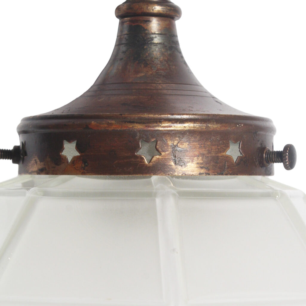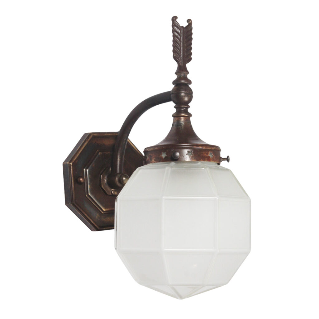 Wonderful antique cast bronze one-arm sconce with glass shade, dating from the early 1900s. This sconce features a sleek octagonal bronze backplate, from which a smooth arm curls out to support a complementary downward-facing fitter and frosted octagonal glass globe. This wall lamp is in excellent antique condition with no cracks or breaks to the glass, just the expected fleabites around the edges. The sconce has been professionally rewired and comes with all the necessary attachments for modern installation. The sconce measures 4-5/8” wide (backplate), 6″ wide (globe), 12-1/2″ tall overall, and has a 8″ projection.