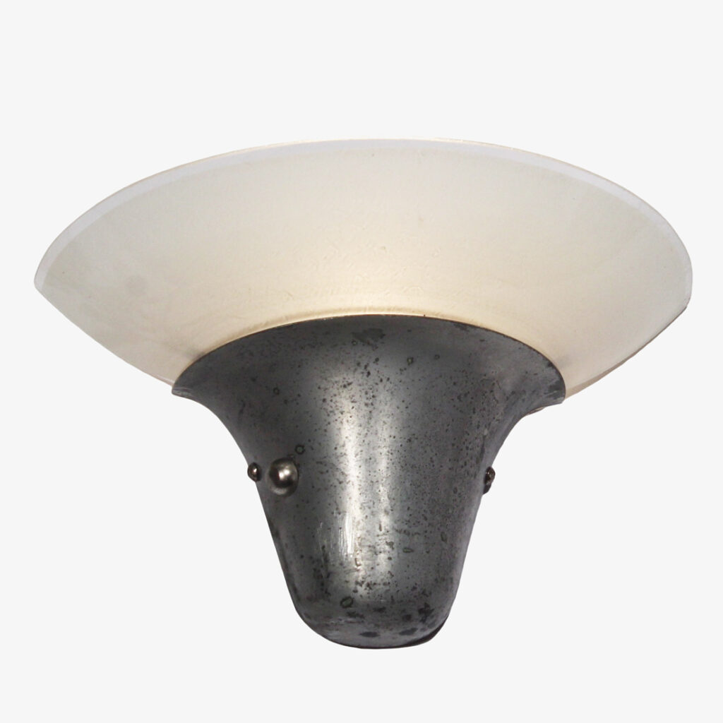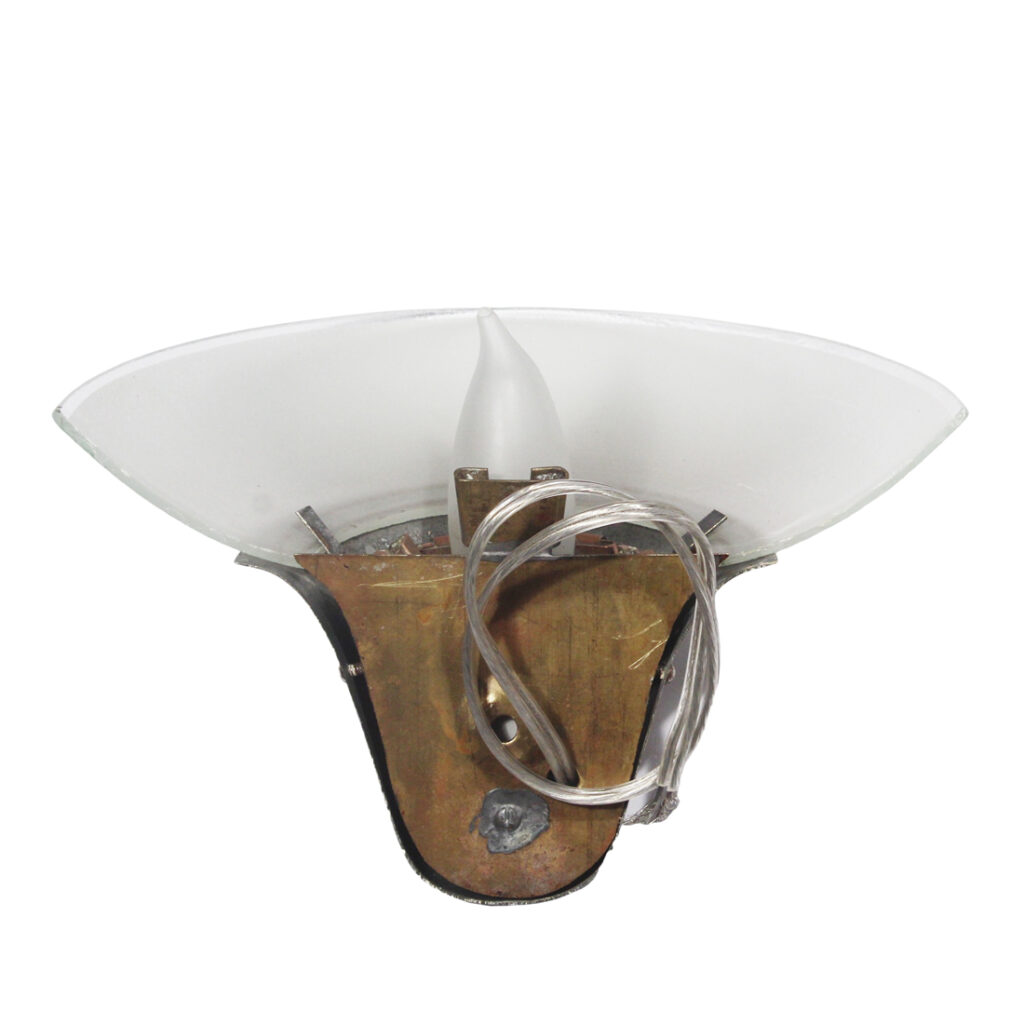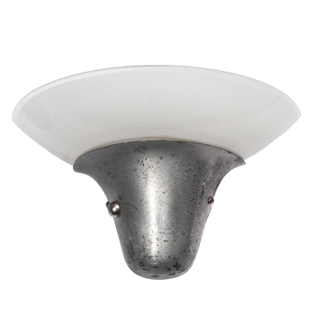 It is in excellent antique condition with no cracks or breaks to the glass, just the expected fleabites around the rim. The sconce has been professionally rewired and comes with all the necessary attachments for modern installation. It measures 8-3/4” wide, approx. 5-3/4” tall, and has a projection of 5”.
