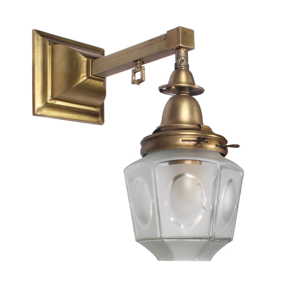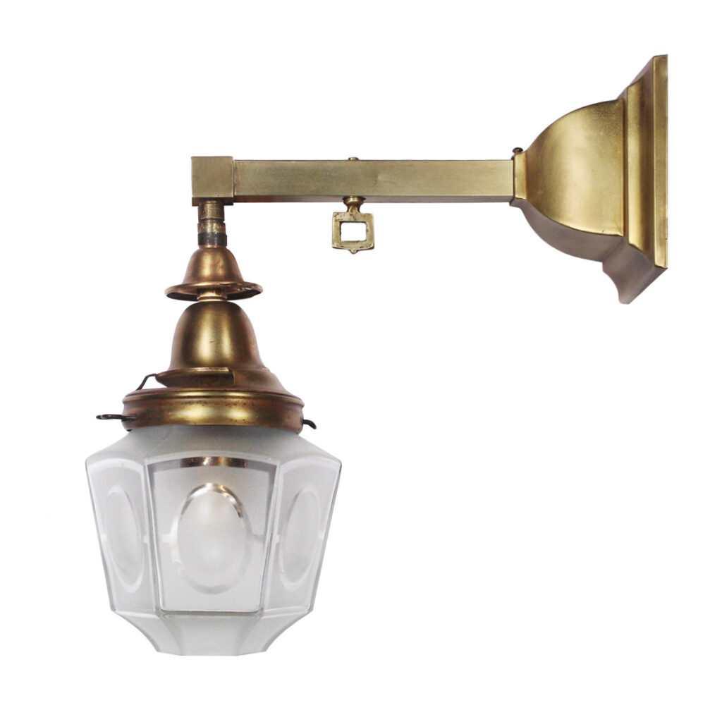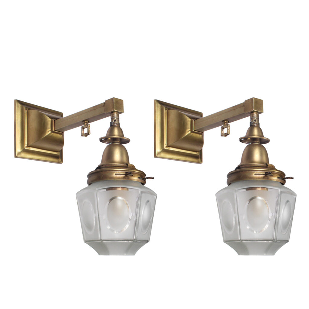 Lovely pair of antique brass single arm sconces with glass shades, originally gas and now completely wired for electricity. Salvaged out of a home in Concord, NH, each sconce features a square brass backplate with a beautiful beveled border; a single arm extends from its center and affixes to a complementary downward-facing fitter and frosted glass shade. These wall lamps are in excellent condition with a couple of small chips and the expected fleabites around the edges (pictured). The sconces have been professionally rewired and come with all the necessary attachments for modern installation. The sconces each measure 5” wide, 12-1/2″ tall, and have a 11″ projection. A coordinating sconces can be found under product code NSP1766-RW.