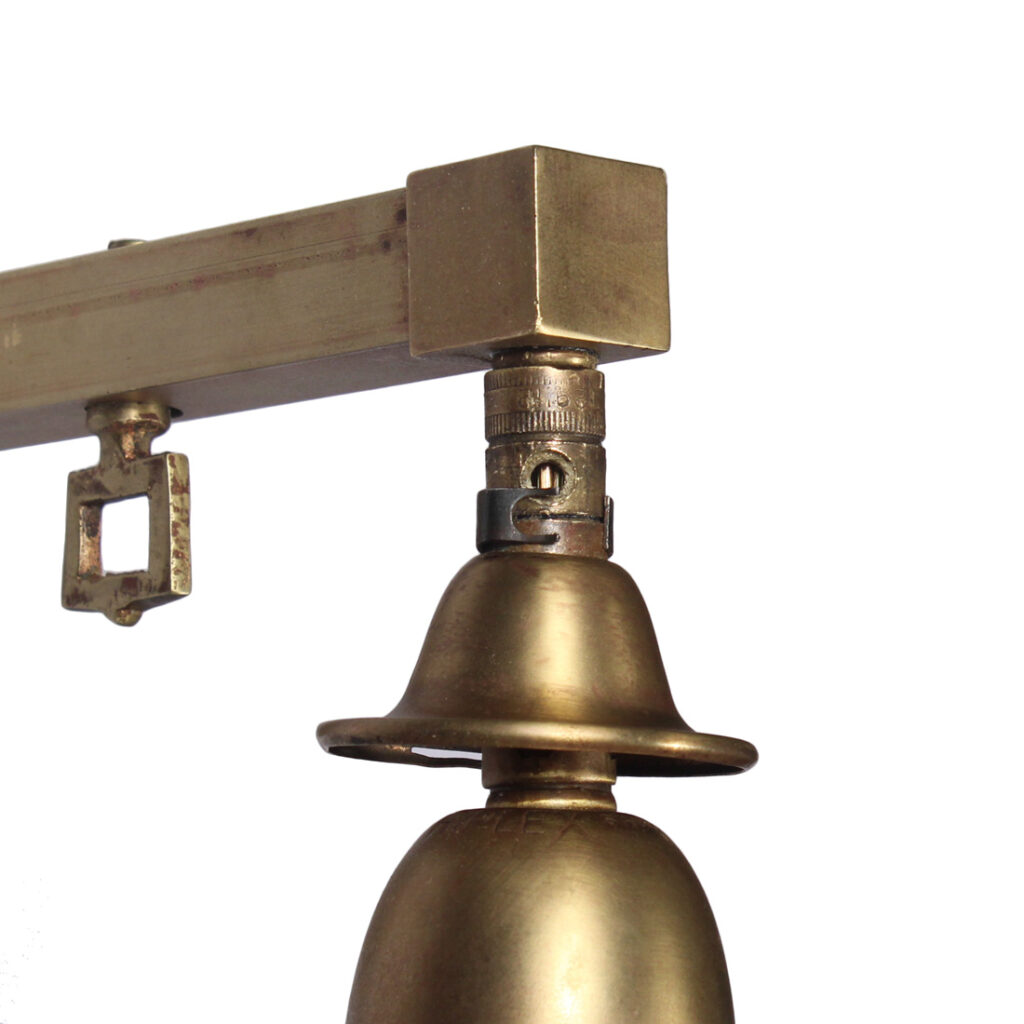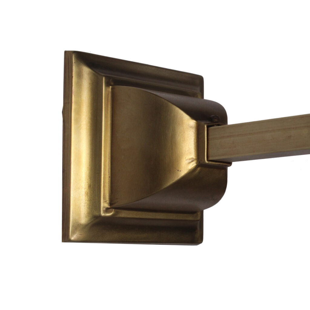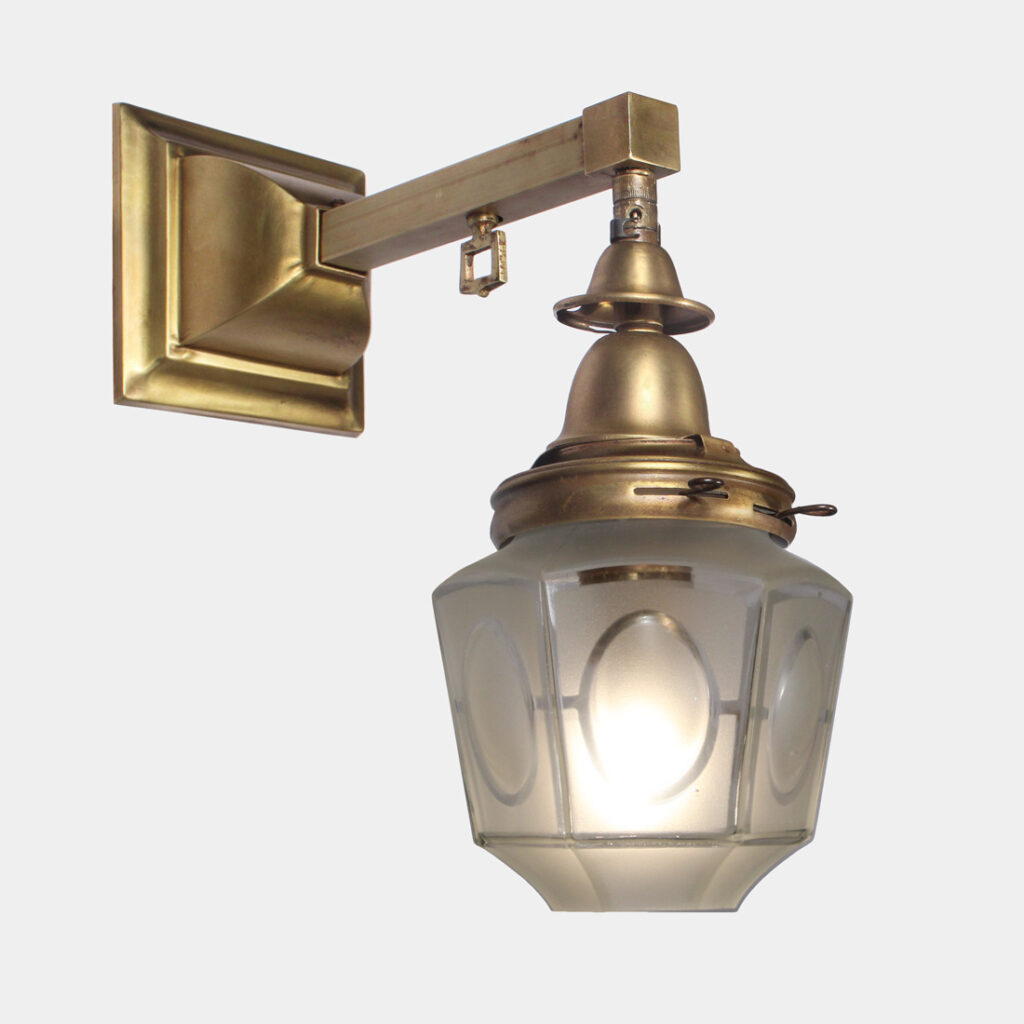Lovely pair of antique brass single arm sconces with glass shades, originally gas and now completely wired for electricity. Salvaged out of a home in Concord, NH, each sconce features a square brass backplate with a beautiful beveled border; a single arm extends from its center and affixes to a complementary downward-facing fitter and frosted glass shade. These wall lamps are in excellent condition with a couple of small chips and the expected fleabites around the edges (pictured). The sconces have been professionally rewired and come with all the necessary attachments for modern installation. The sconces each measure 5” wide, 12-1/2″ tall, and have a 11″ projection. A coordinating sconces can be found under product code NSP1766-RW.