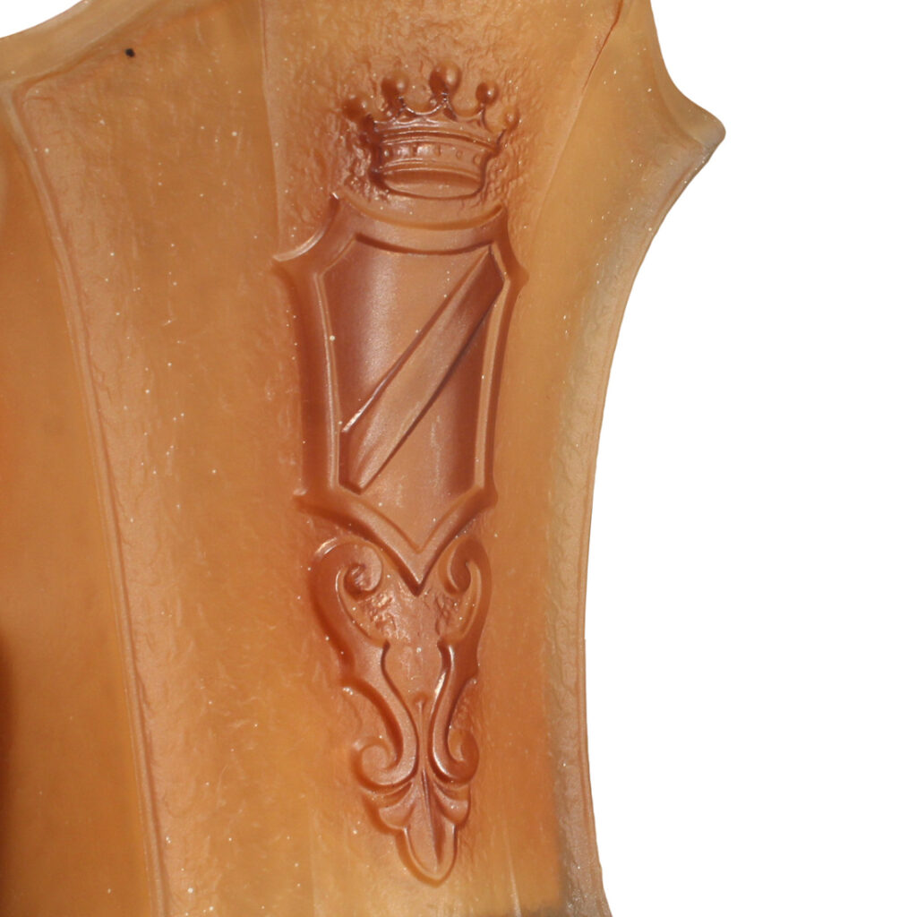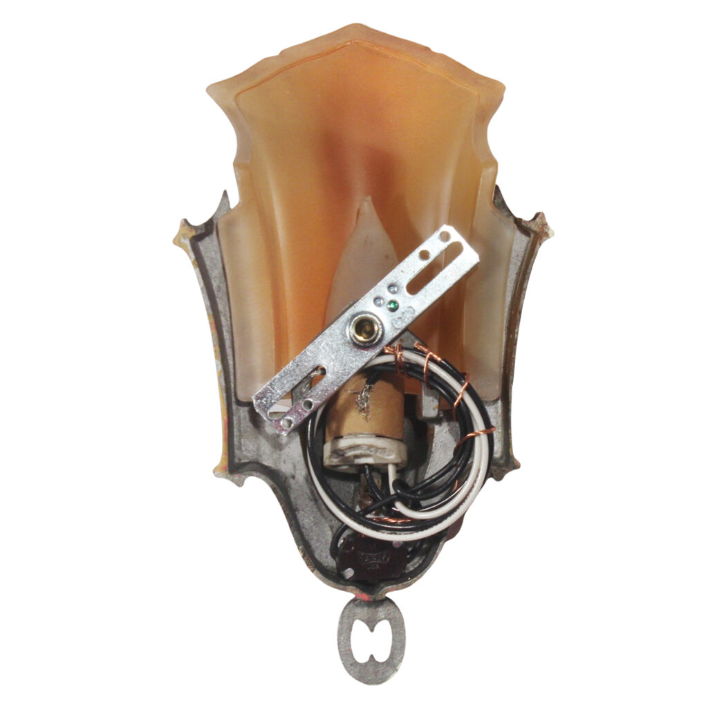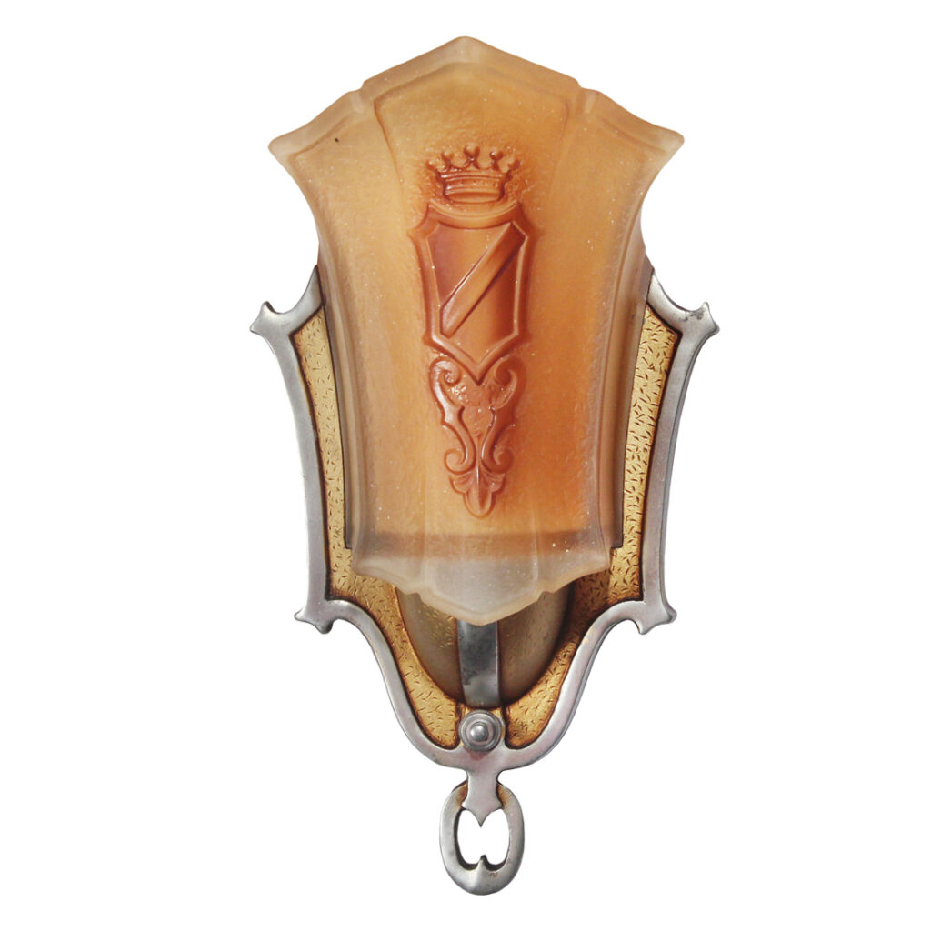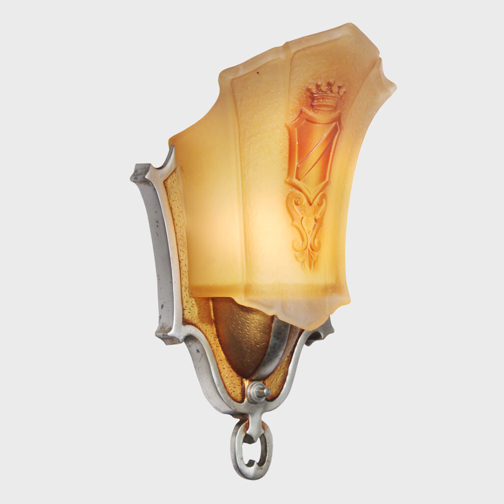 Gorgeous matching antique Art Deco slip shade sconces, circa 1930, and found in a home in Nashville, TN. Each sconce features an angular two-tone backplate with textured detailing. An amber-hued glass slipper shade fits within the center of the backplate and boasts a stylized crown and shield motif. These wall lamps are in excellent antique condition with the expected fleabites found around the edges of the shades. They have all been professionally rewired and come with all the necessary attachments for modern installation. We kept the original non-functioning turn switches for nostalgia’s sake; however, we will gladly replace them with new ones if desired. The sconces each measure 5-5/8″ wide, 10-1/2″ tall, and project 5″. THE PRICE LISTED IS FOR EACH INDIVIDUAL SCONCE.