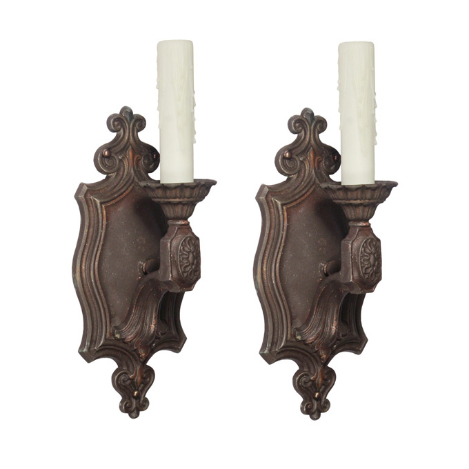 Wonderful pair of antique single-arm sconces, dating from the 1920s and found in a home in Atlanta, GA. These wall lamps are in excellent condition with a fabulous aged finish; they have been professionally rewired and come with all the necessary attachments for modern installation. The sconces measure 4-3/4” wide, 12-1/4” tall, and have a projection of 4-3/8”.