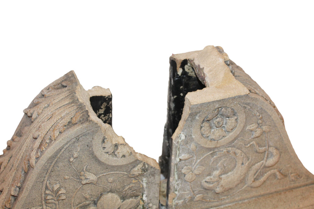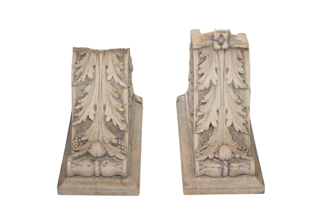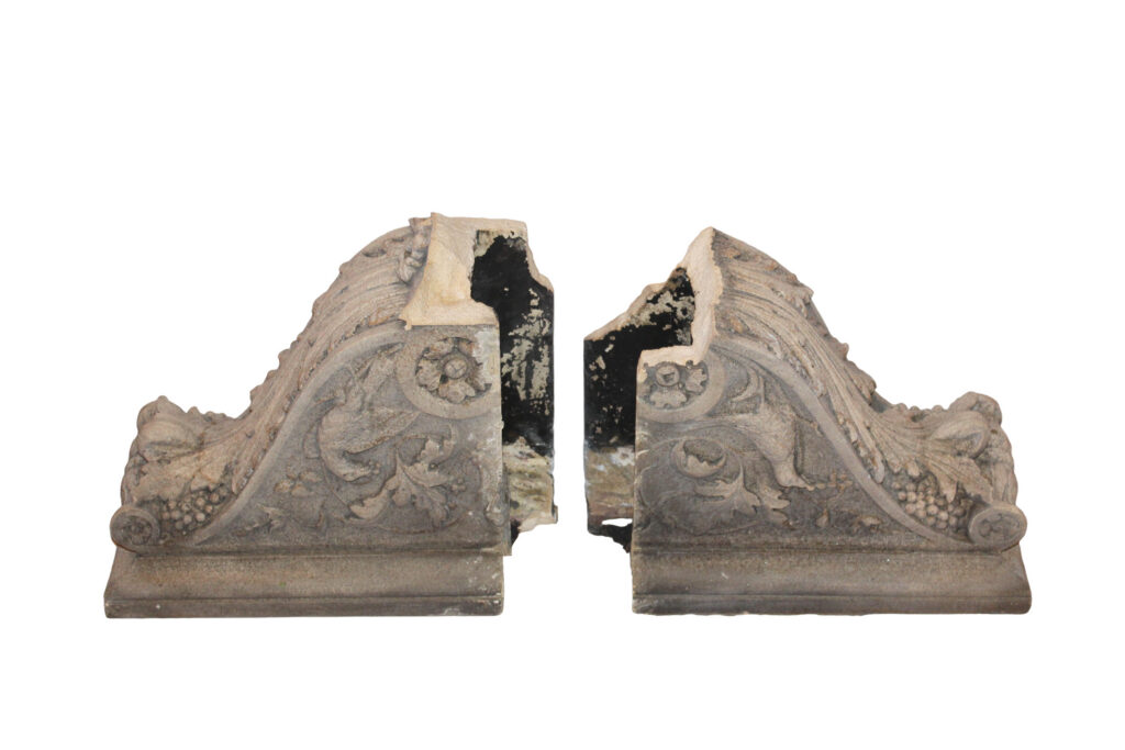 Detailed corbel fragments from the underside of a mantel by the William H. Jackson Company based out of Chicago and NY. These pieces were salvaged from Windsor House (“Castle Above the Clouds”) on Lookout Mountain, Tennessee. They formed the underside element of a full mantel, originally illustrated in early 20th-century catalogues as a “Cretan Stone Mantel,” inspired by 15th-century Italian Renaissance design.
