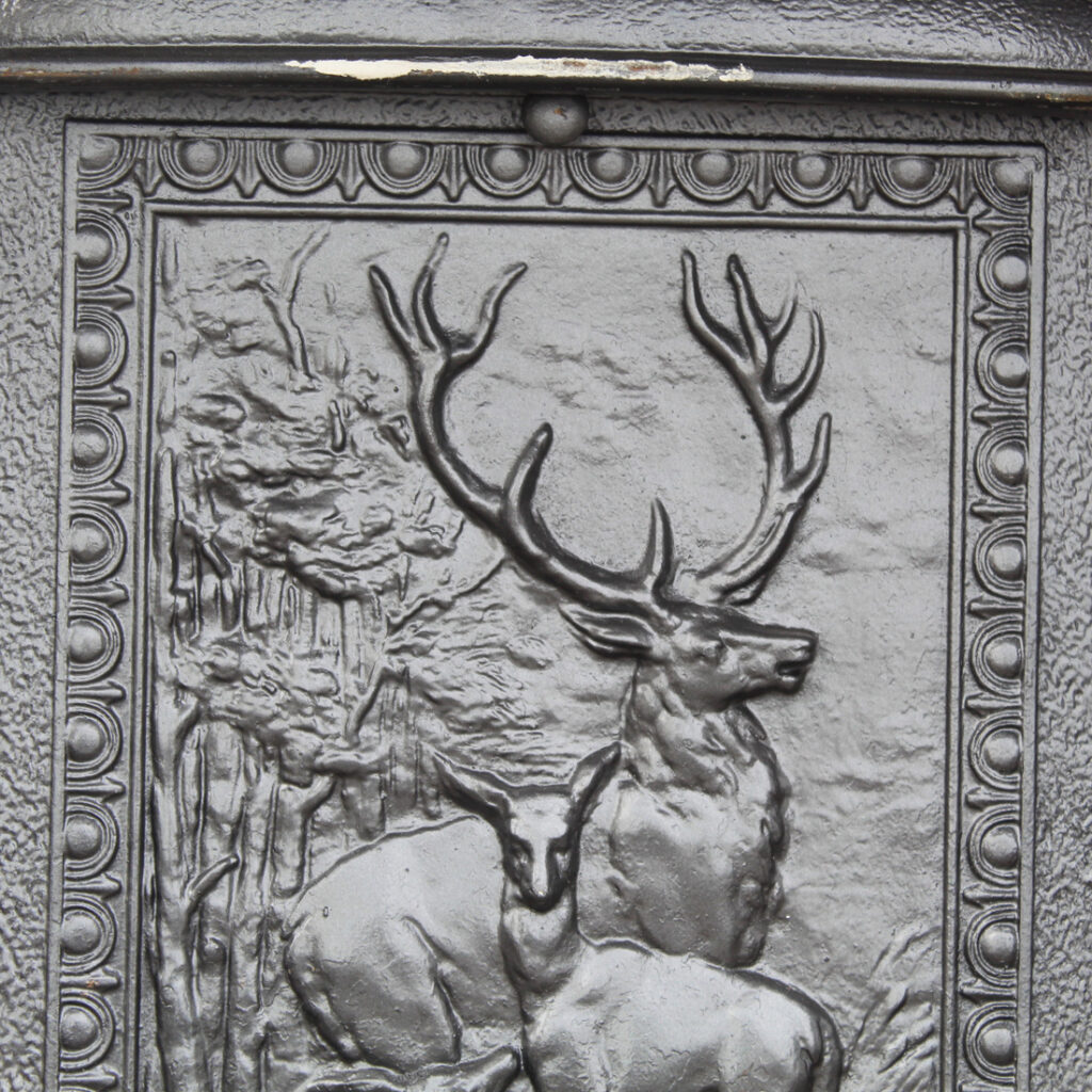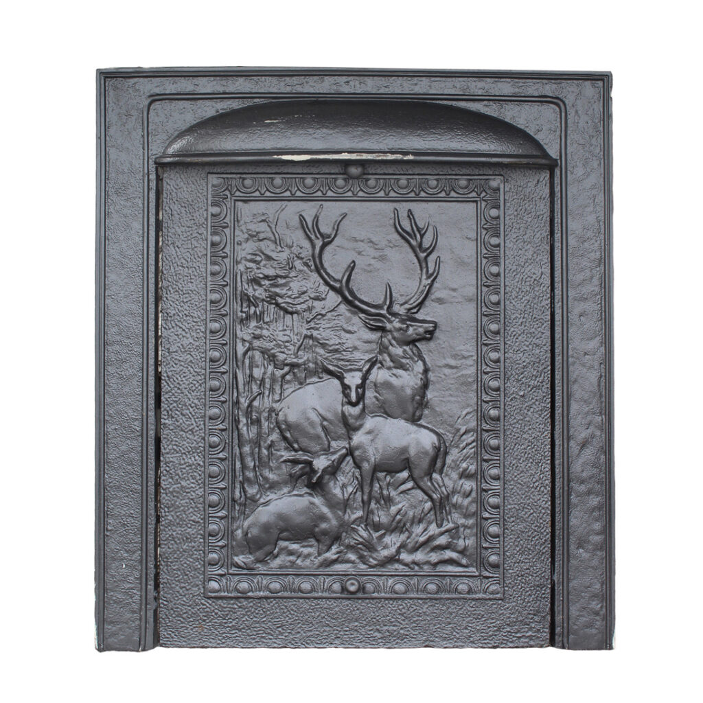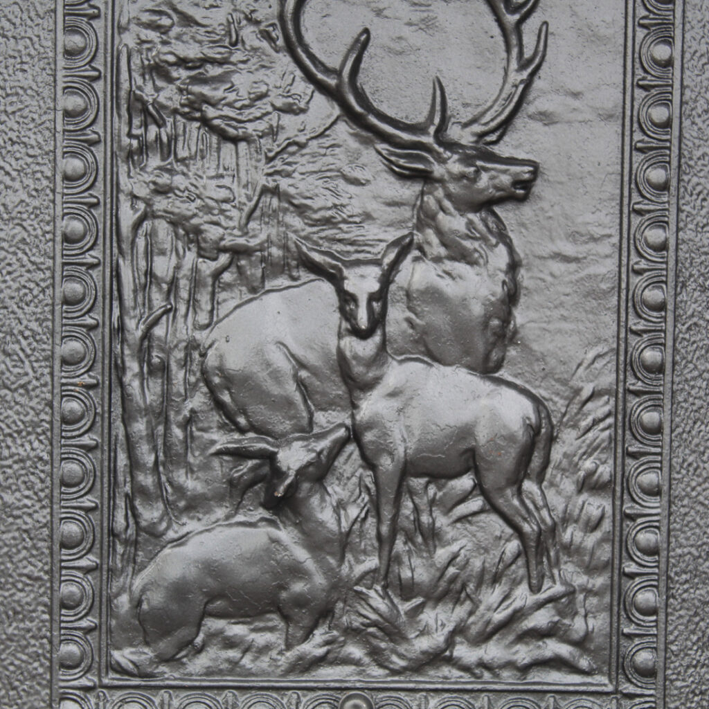A handsome antique cast iron fireplace summer cover set dating to the late 19th century, featuring a richly detailed insert panel set within a simple, classically styled surround. The central cover depicts a majestic stag with branching antlers, accompanied by deer in a natural woodland setting, rendered in high relief with remarkable depth and texture. This summer cover set is in very good antique condition (as pictured). The outer frame measures 26-1/4″ wide, 30-1/4″ tall, and is 2″ deep. The insert measures 19-3/4″ wide, 27″ tall. This piece requires a custom shipping quote; please contact us if you have any questions.