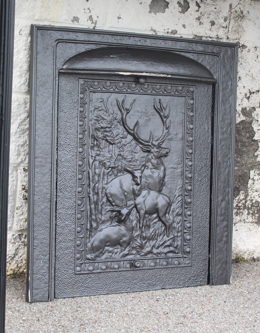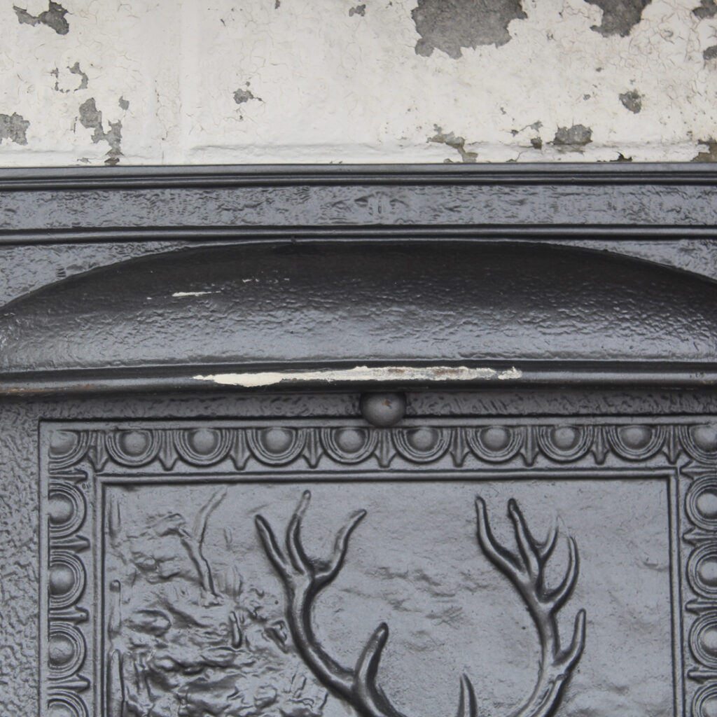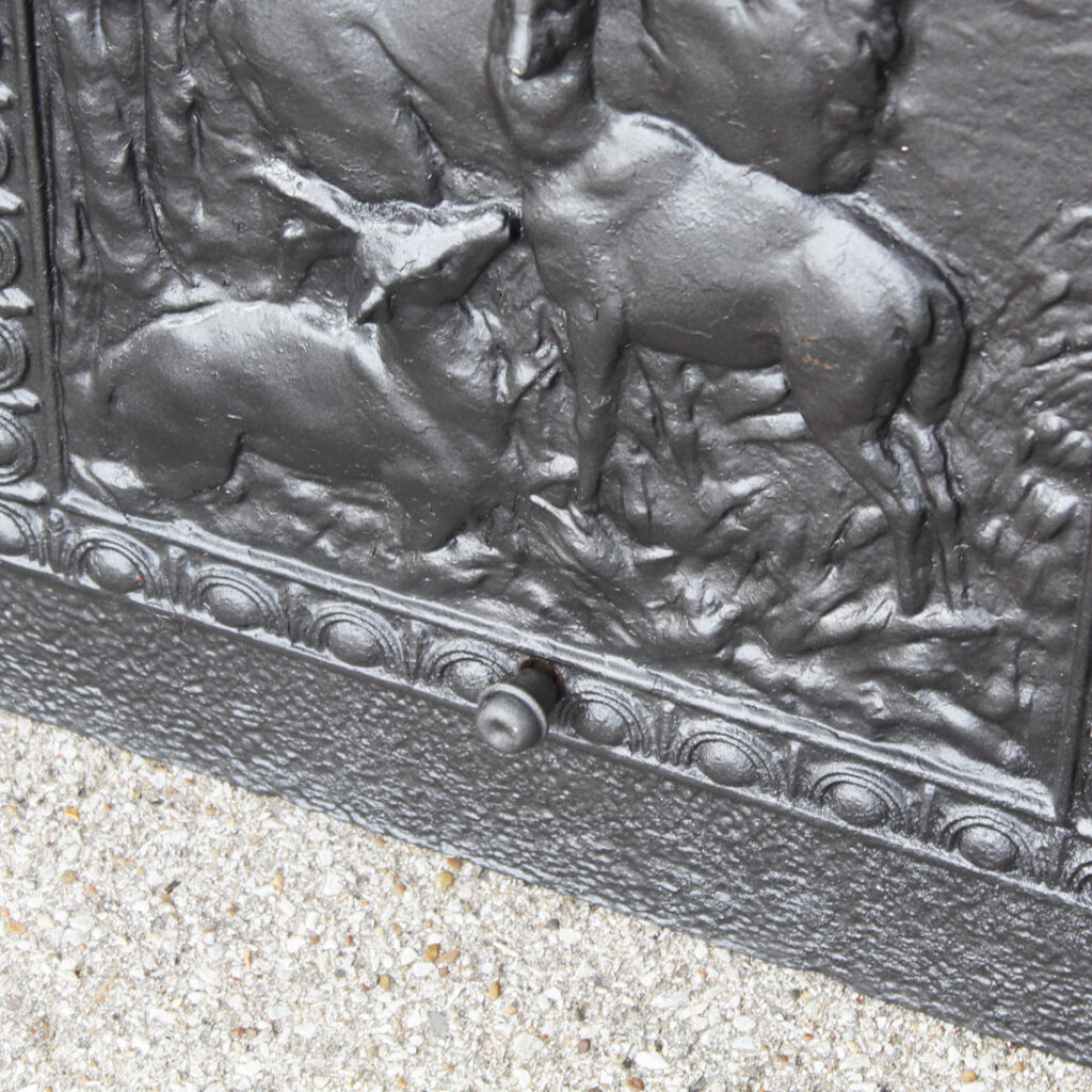 A handsome antique cast iron fireplace summer cover set dating to the late 19th century, featuring a richly detailed insert panel set within a simple, classically styled surround. The central cover depicts a majestic stag with branching antlers, accompanied by deer in a natural woodland setting, rendered in high relief with remarkable depth and texture. This summer cover set is in very good antique condition (as pictured). The outer frame measures 26-1/4″ wide, 30-1/4″ tall, and is 2″ deep. The insert measures 19-3/4″ wide, 27″ tall. This piece requires a custom shipping quote; please contact us if you have any questions.