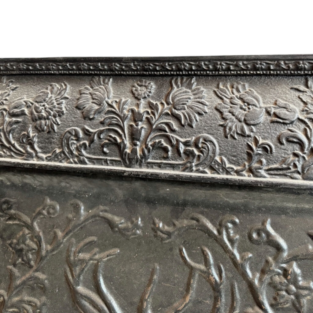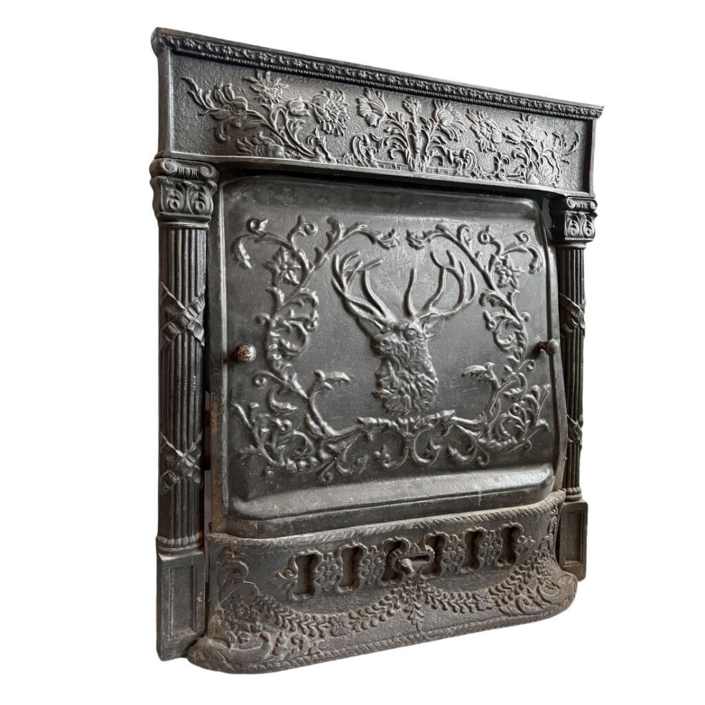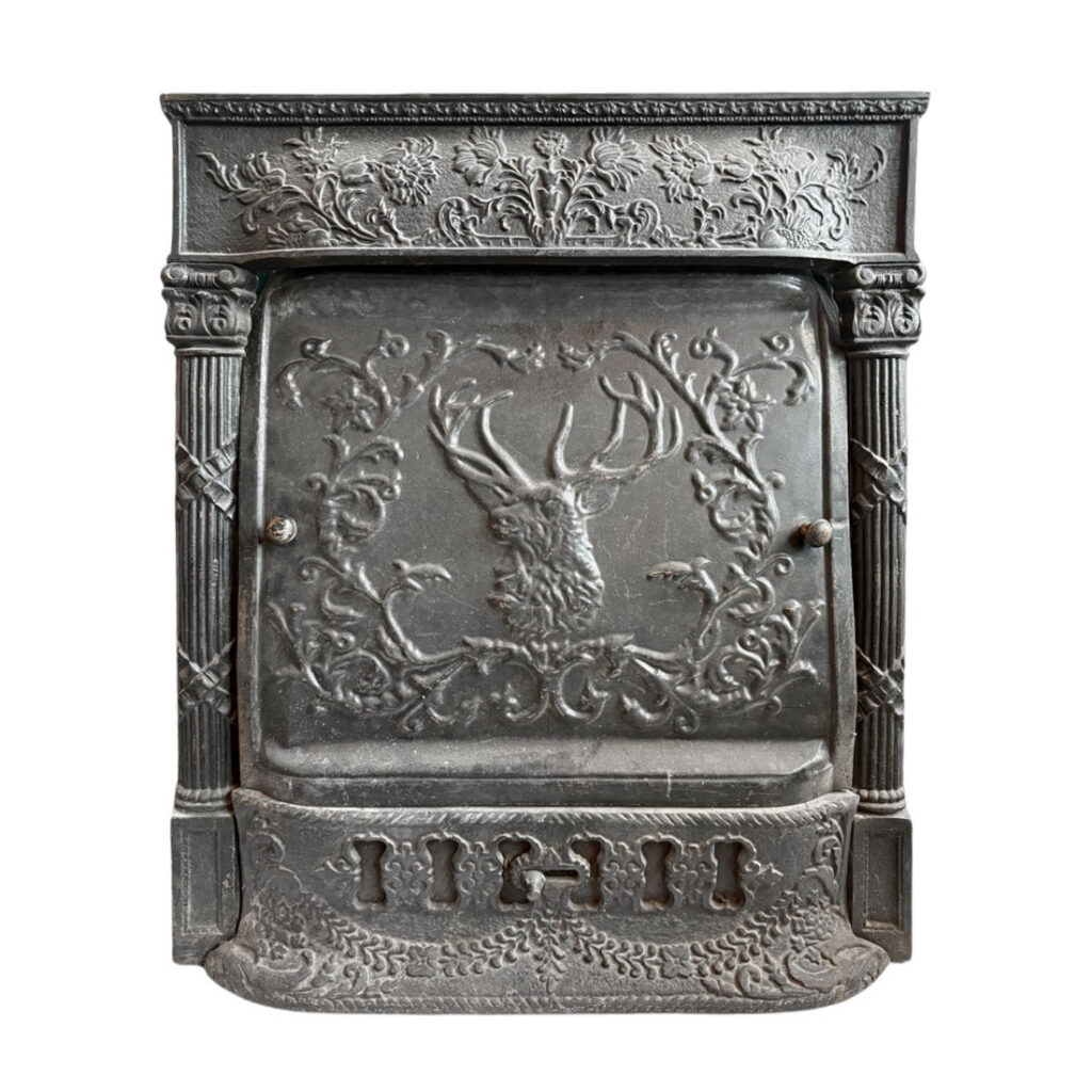 An incredible antique fireplace summer cover set, dating from the early 1900s and ornamented with figural details.The central panel features a stag’s head framed by scrolling foliate decoration, creating a dramatic focal point with strong visual depth. The surrounding border is adorned with elaborate floral and botanical motifs, while fluted side columns and decorative capitals lend a sense of structure and classical balance. The lower section is equally detailed, with pierced elements and delicate garland-like ornamentation adding texture and interest. Originally intended to cover a fireplace during the summer months, this piece now serves as both a functional architectural element and a distinctive decorative statement. This summer cover set is in very good antique condition, with some of the corners on the insert slightly bent (as pictured). The outer frame measures 25-1/8″ wide, 30-1/4″ tall, and is 2-1/4″ deep. The insert measures 20-3/4″ wide, 19-1/4″ tall, and is 2″ deep; the base bumper measures 22-1/4″ wide, 7″ tall, and projects 4″. This piece requires a custom shipping quote; please contact us if you have any questions.