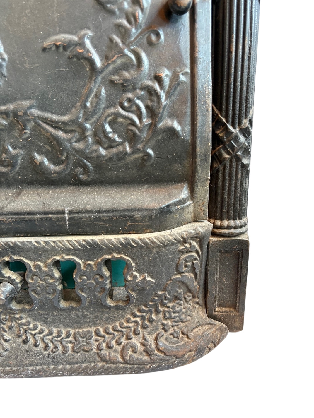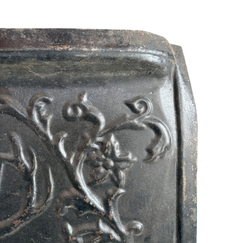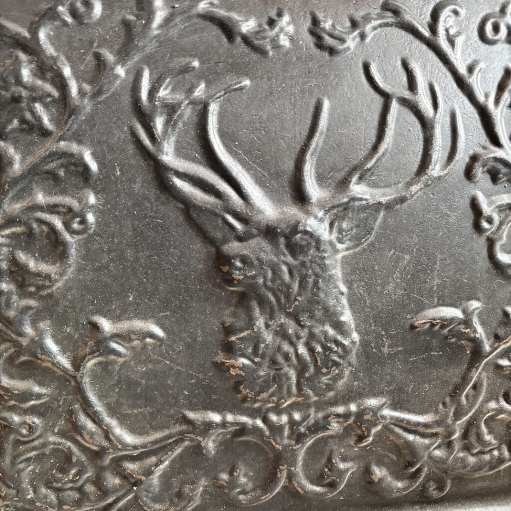 An incredible antique fireplace summer cover set, dating from the early 1900s and ornamented with figural details.The central panel features a stag’s head framed by scrolling foliate decoration, creating a dramatic focal point with strong visual depth. The surrounding border is adorned with elaborate floral and botanical motifs, while fluted side columns and decorative capitals lend a sense of structure and classical balance. The lower section is equally detailed, with pierced elements and delicate garland-like ornamentation adding texture and interest. Originally intended to cover a fireplace during the summer months, this piece now serves as both a functional architectural element and a distinctive decorative statement. This summer cover set is in very good antique condition, with some of the corners on the insert slightly bent (as pictured). The outer frame measures 25-1/8″ wide, 30-1/4″ tall, and is 2-1/4″ deep. The insert measures 20-3/4″ wide, 19-1/4″ tall, and is 2″ deep; the base bumper measures 22-1/4″ wide, 7″ tall, and projects 4″. This piece requires a custom shipping quote; please contact us if you have any questions.