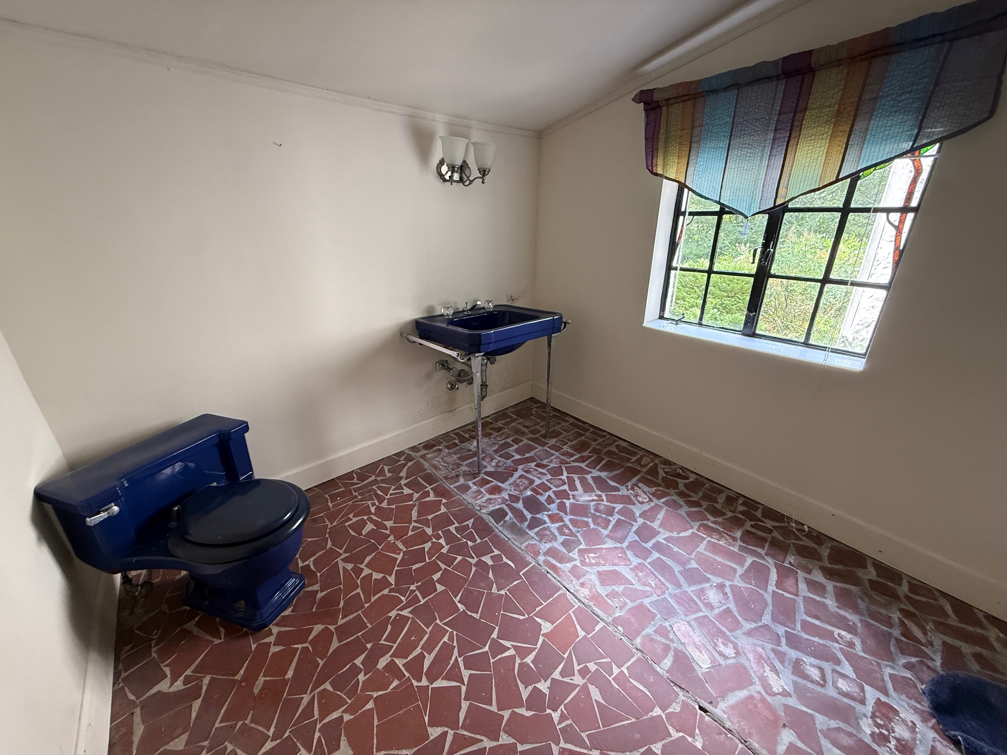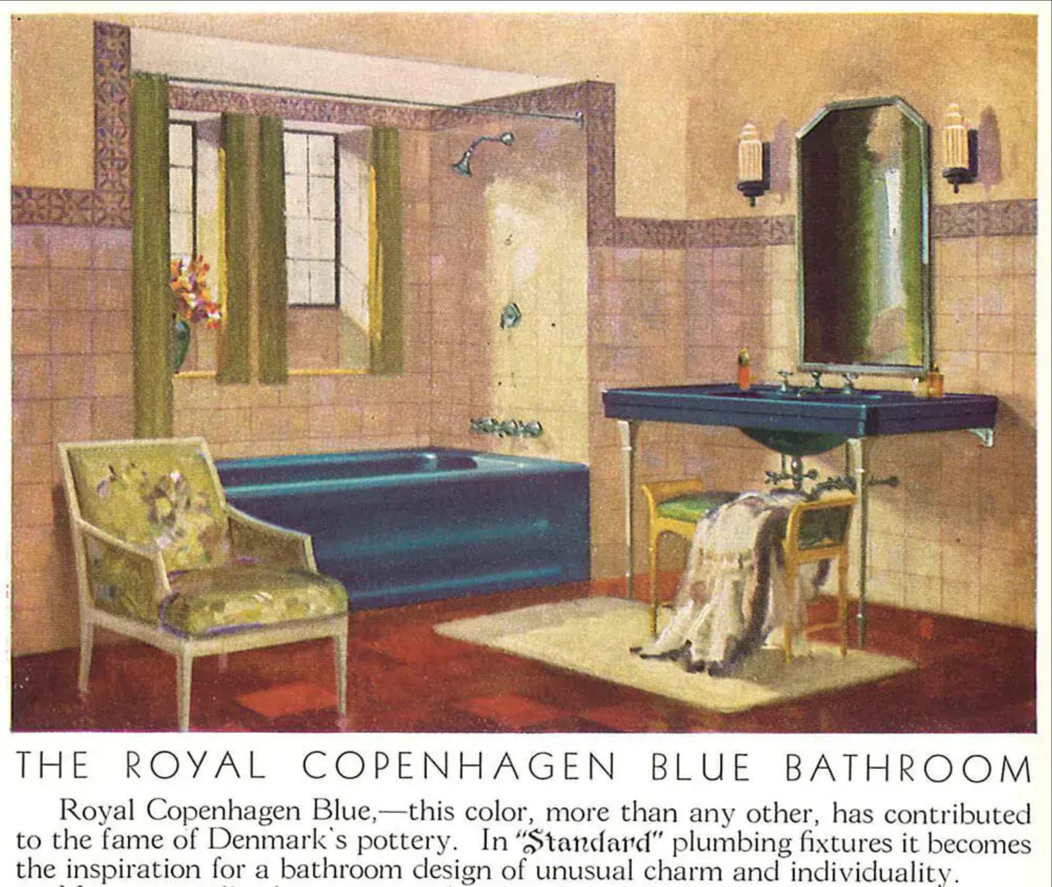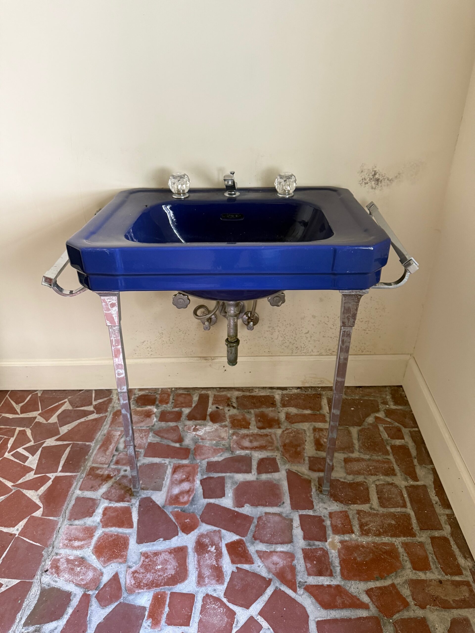 A charming wall-mount “Royal Copenhagen Blue” bathroom sink, salvaged from the historic “Windsor” home—also known as the Castle Above the Clouds—perched atop Lookout Mountain, Tennessee. Built in the 1930s by George and Elizabeth Scholze, the residence reflects the couple’s refined taste and attention to detail. George Scholze, second-generation owner of the prominent Scholze Tannery in Chattanooga, helped earn the city its nickname, “Saddle Capital of the World.”