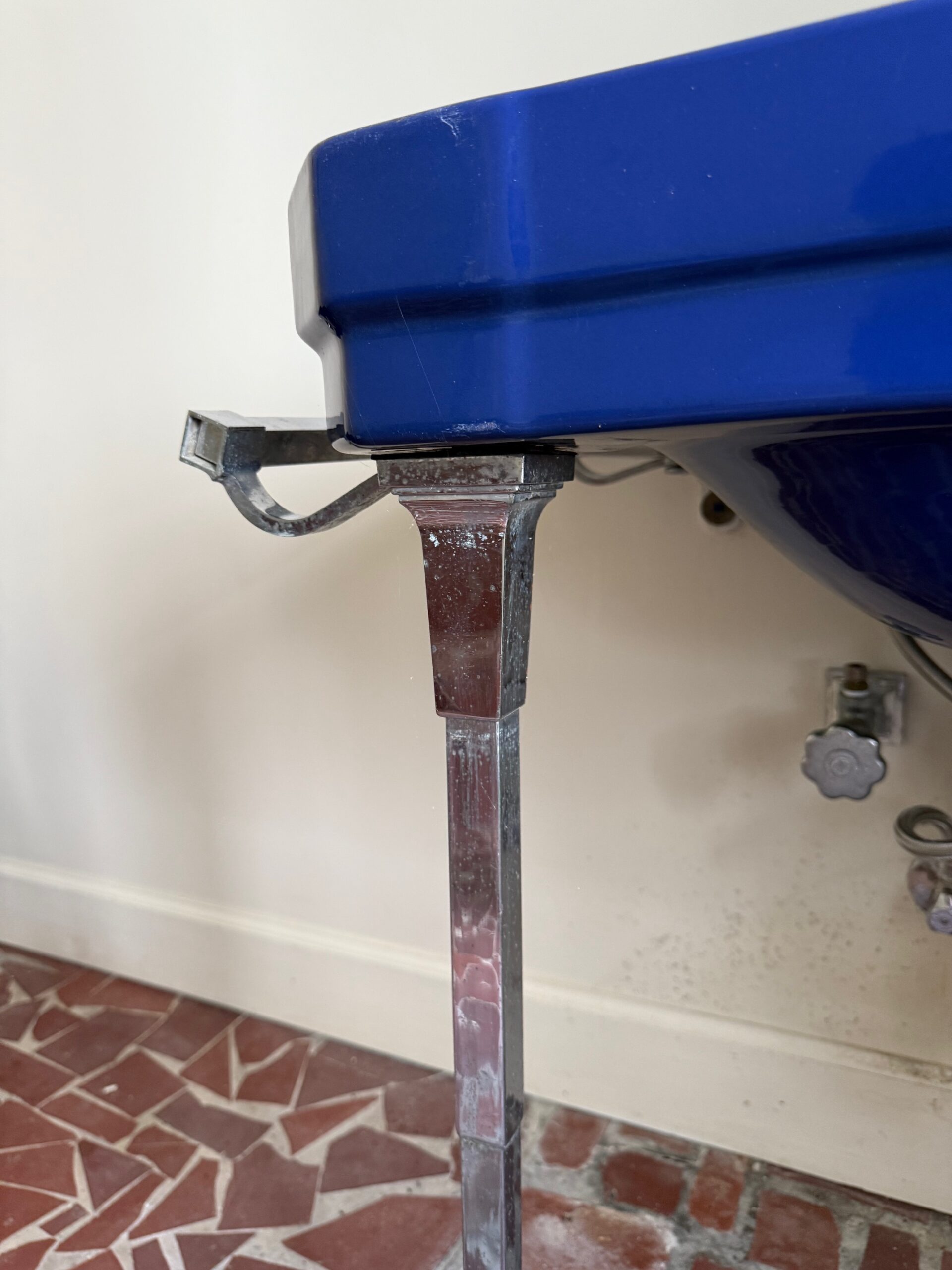 The sink remains in very good condition with only minimal wear (as shown), and still retains several of its original, non-functioning antique plumbing fixtures. It measures 27-1/2″ wide, and projects 23″ from the wall.