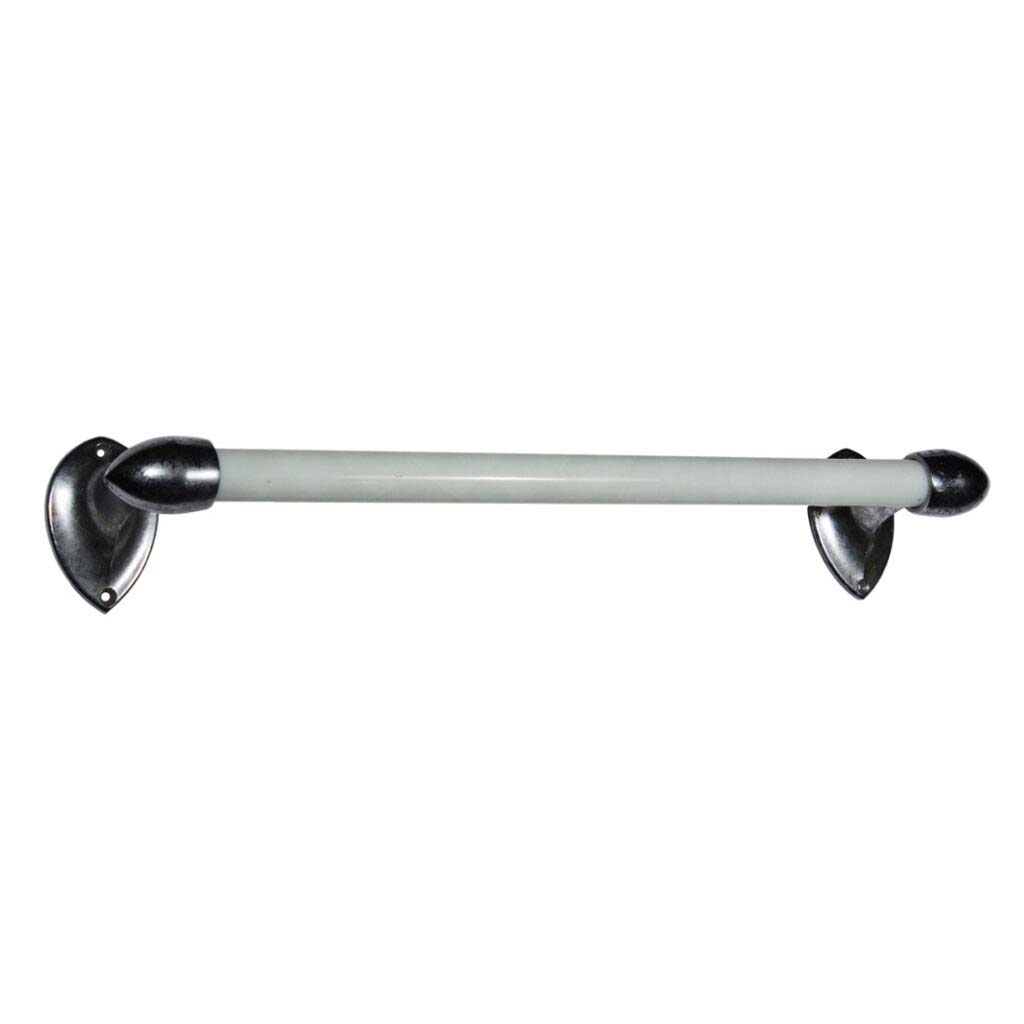 A marvelous streamlined antique milk glass towel rack, dating from the early 1900’s. This wall mounted towel rod is in excellent antique condition with a nicely aged patina and would be perfect for a bathroom or craft project. The rack is 16-1/4″ long and has a 3-1/4″ projection.