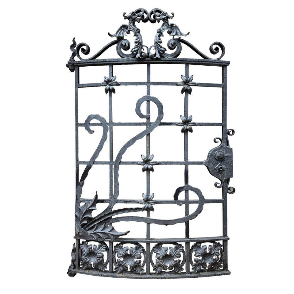 At the crest of the piece sits a pair of stylized winged griffins, mirrored in a classic heraldic posture. Their feathered wings, elongated necks, and curled tails symbolize vigilance and protection—motifs historically used to guard architectural thresholds. This rare decorative detail elevates the gate from functional ironwork to sculptural art.