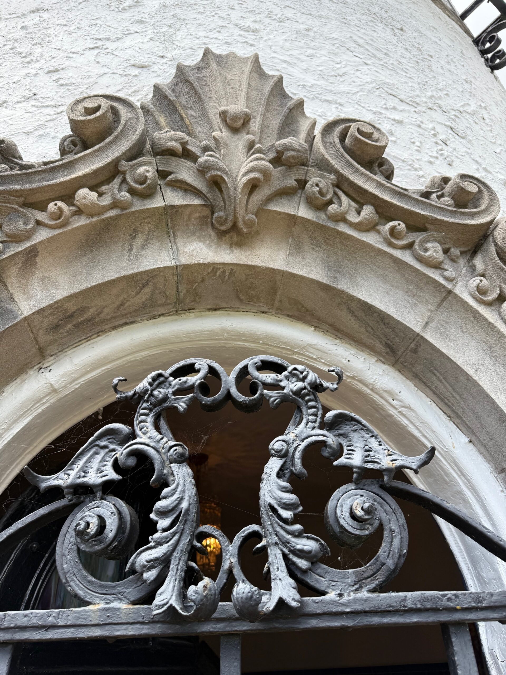 A beautifully hand-forged, architecturally curved iron entry gate salvaged from the landmark Windsor House—the famed Castle Above the Clouds—on Lookout Mountain, Tennessee. Installed in the home’s rounded tower entry during its lavish 1930s construction, this exceptional gate represents the pinnacle of custom ornamental ironwork commissioned for George and Elizabeth Scholze.