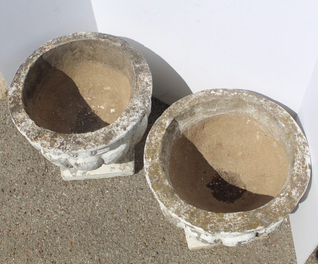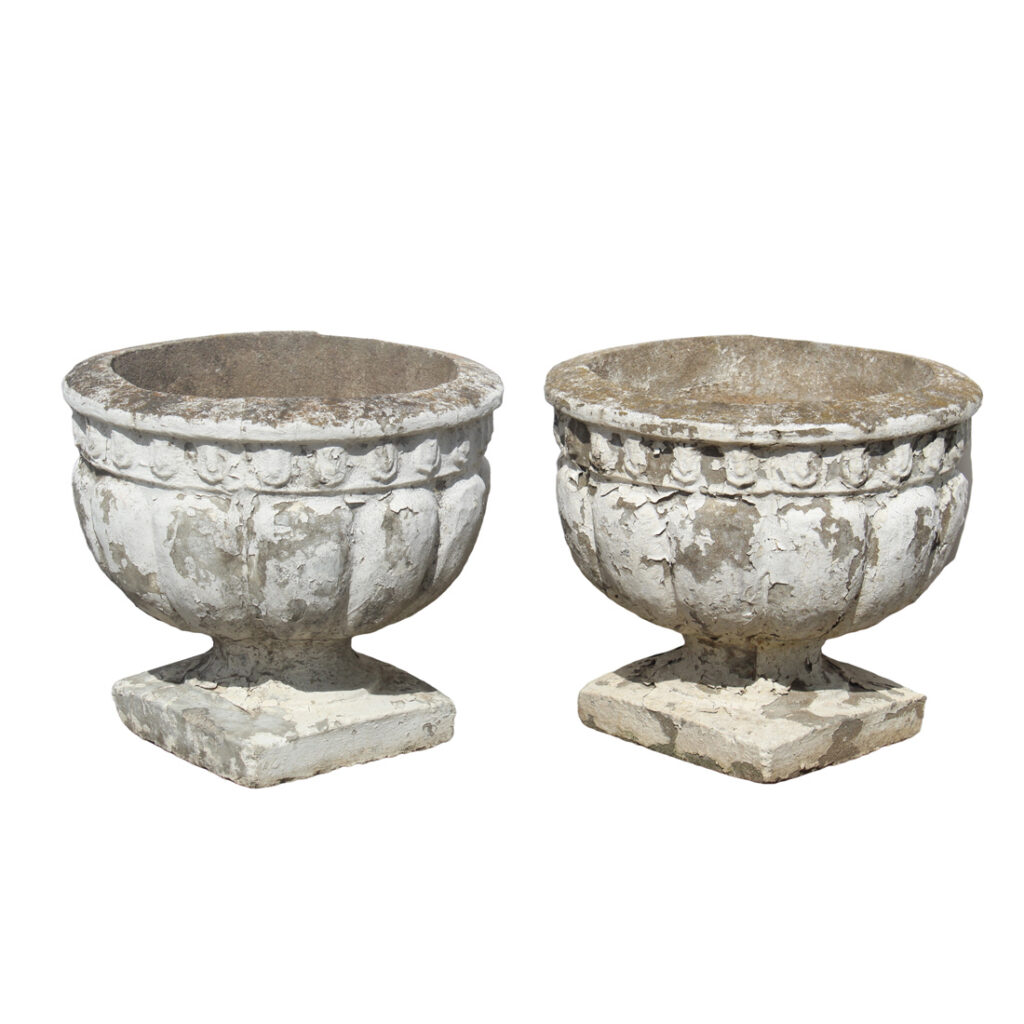 A pair of fabulous antique planters, dating from early 1900’s. Salvaged out of Nashville, TN, each planter features a decorative beaded and gadrooned design. These planters are in good antique condition, with some chips and dings as pictured. Each piece measures approximately 14″ wide by 12-1/2″ tall; the base measures 8-1/2″ square. These pieces require a custom shipping quote; please contact us if you have any questions.