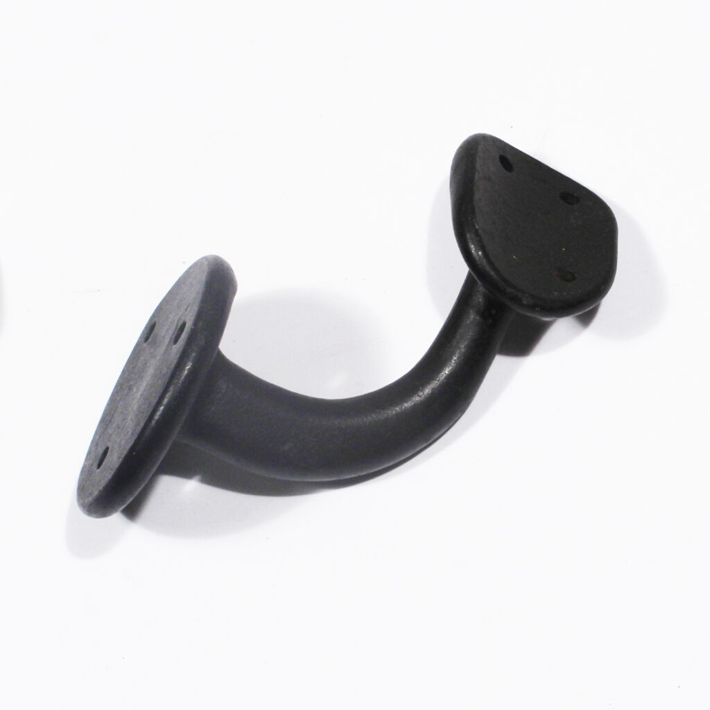 A wonderful antique handrail bracket, dating from the early 1900’s. This bracket is in excellent antique condition with a beautiful dark iron finish. The bracket measures 5″ tall with a 3-1/2″ projection, and the wall plate is 2-1/2″ in diameter.