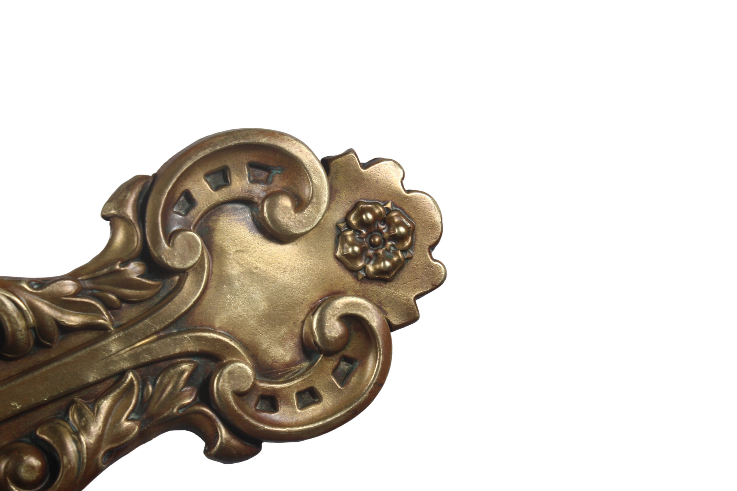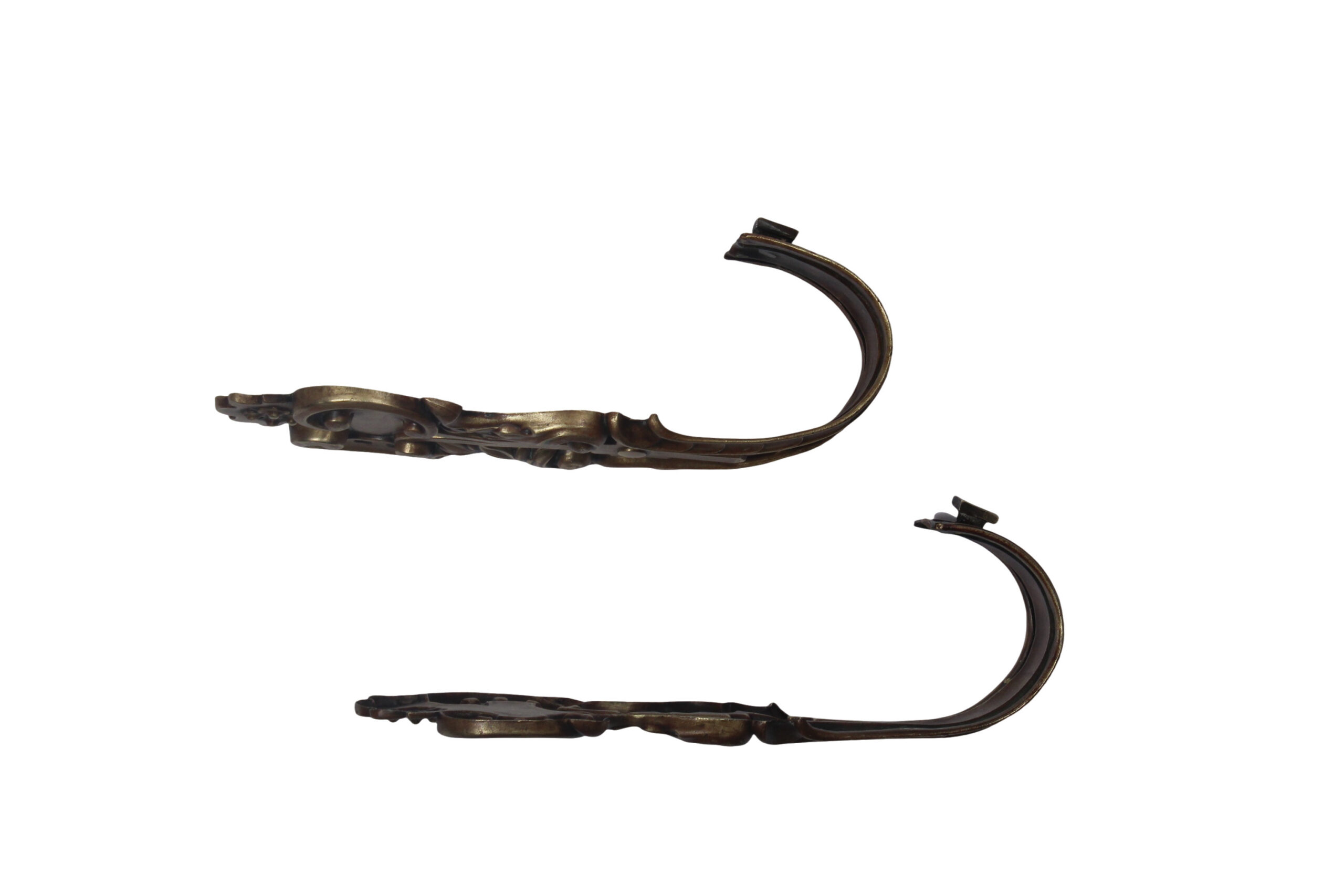 A beautiful pair of antique brass curtain tie backs, dating from the early 1900’s. These Neoclassical tie-backs are in very good antique condition, and retain their gorgeous aged patina. Each piece measures 9-1/4″ wide, 3-1/4″ tall, and project 3-1/4″.