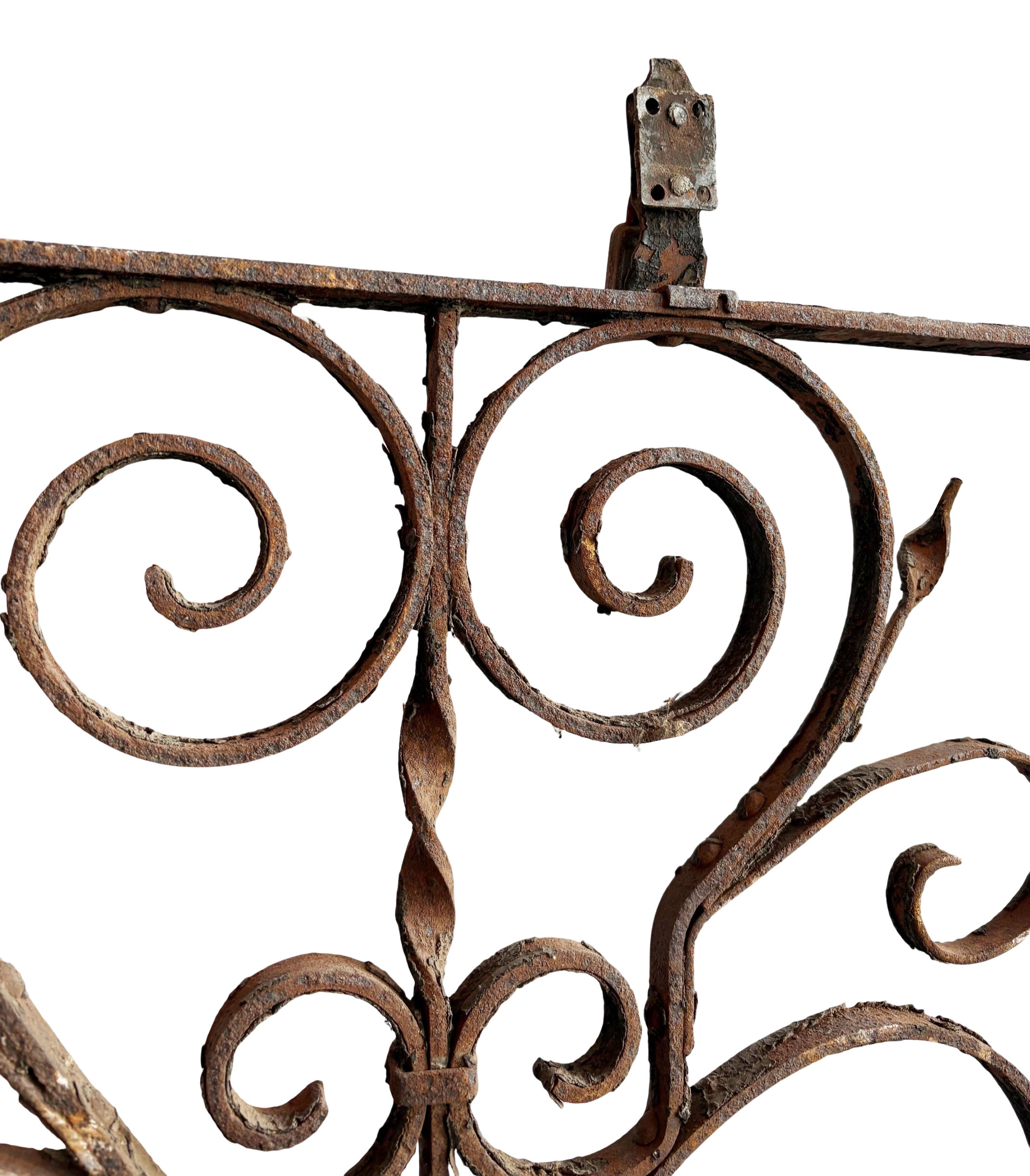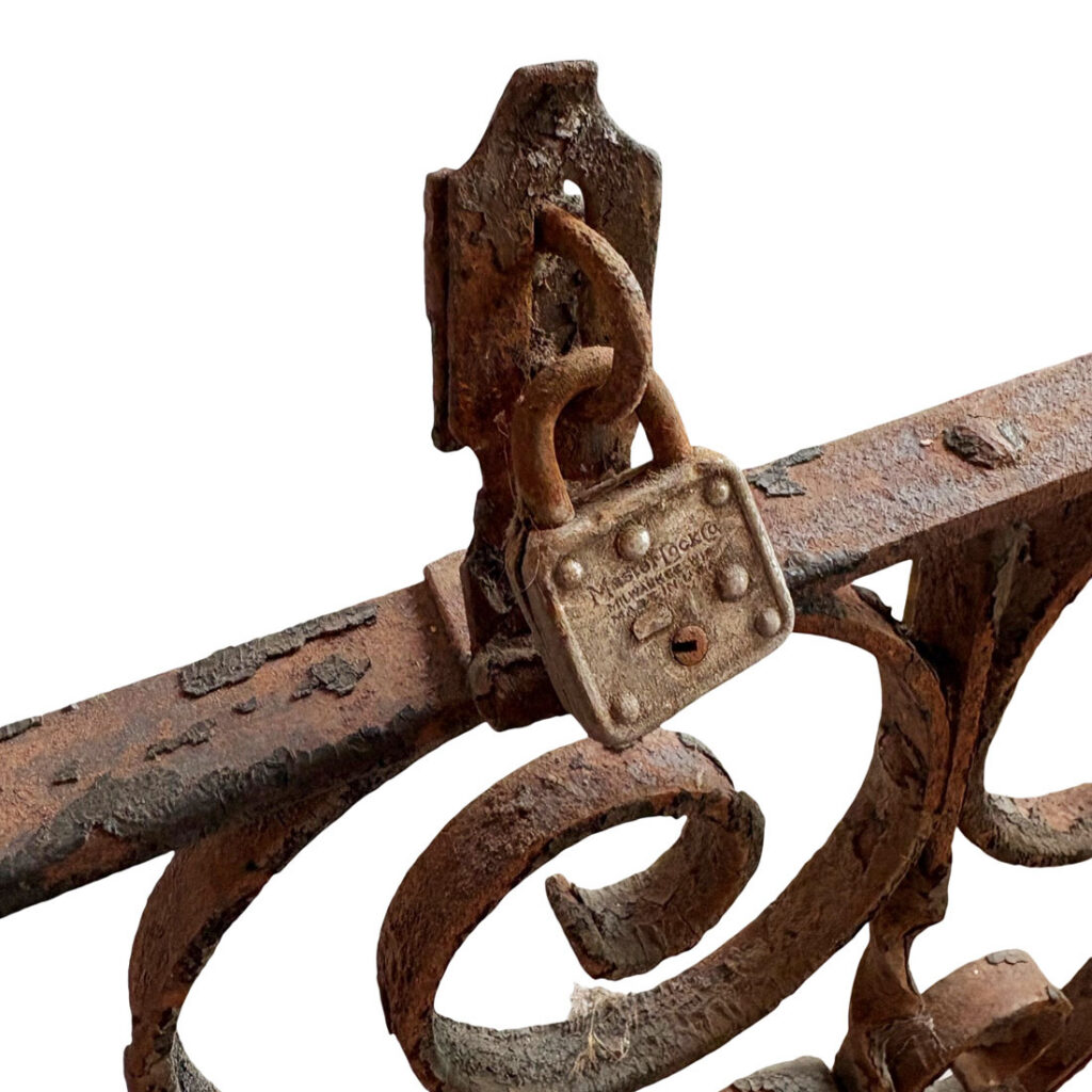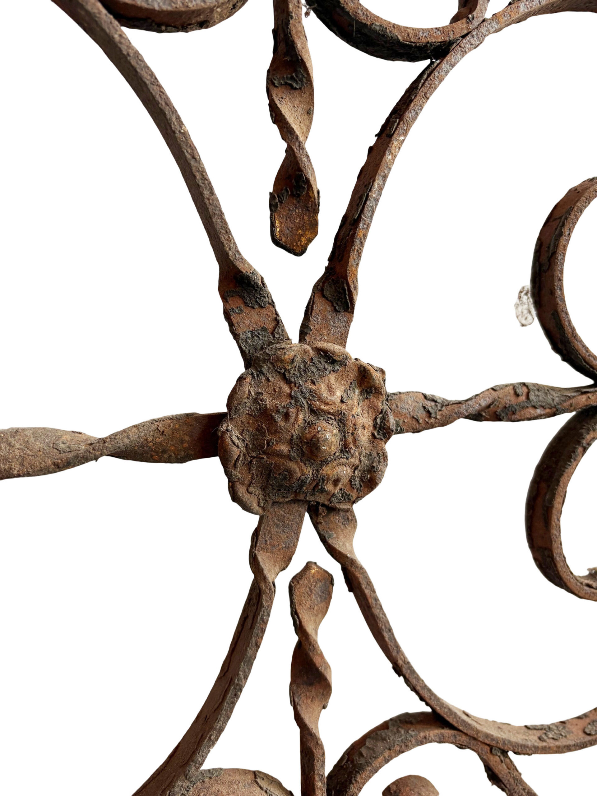 A striking antique wrought iron window guard, featuring a beautifully balanced design centered around a prominent floral rosette motif. This piece showcases classic hand-forged craftsmanship, with elegant scrollwork radiating outward in a symmetrical, almost sunburst-like composition. This piece offers both decorative appeal and historic architectural character, making it a versatile addition to a variety of spaces. The window guard is in very good antique condition with a beautiful aged finish, and is slightly warped (as pictured). This piece of ironwork measures 33″ wide, 20-1/4″ tall (main body), and 26-1/2″ at its tallest. Due to the size of this piece, it requires a custom shipping quote; please contact us if you have any questions. A coordinating window guard can be found under product code NWNG83B-RW.